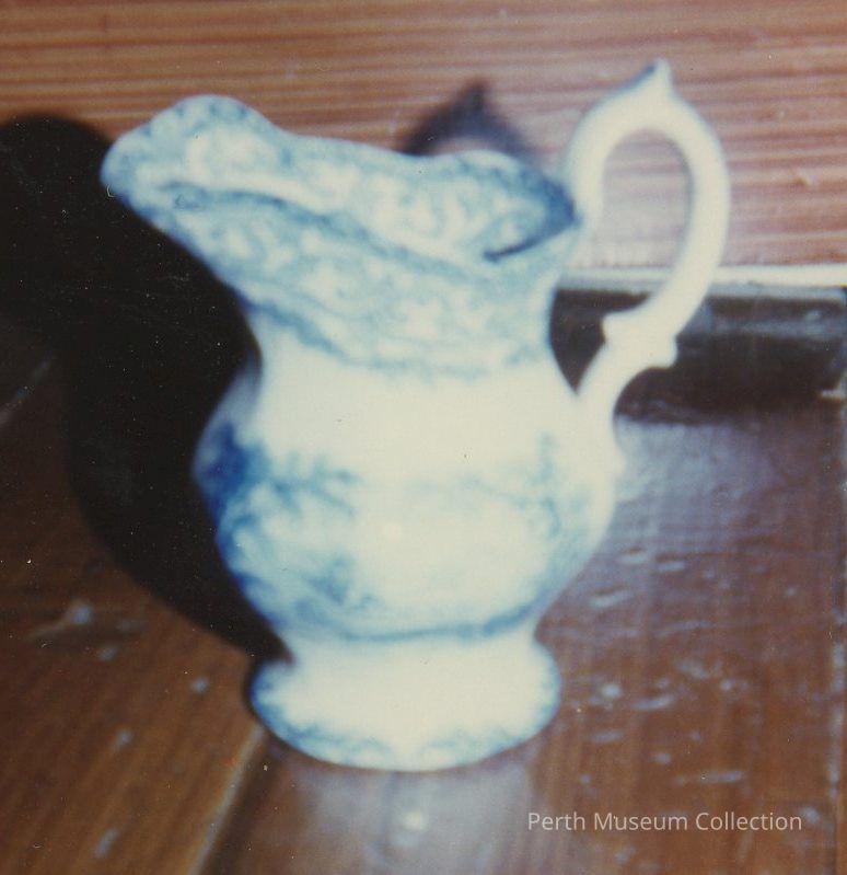This is an early Staffordshire-type blue transfer jug. It may have been a cream jug. At first glance it matches #968.3.1a, b and it is similar, but the design is different. It has a scrolled cartouche design along the edge of the spout, oak leaves along the handle, and a view of a shepherd reclining with his sheep on both sides, framed with trees. There is no mark on the bottom. The handle has a slight hair line crack where it joins the body of the jug, otherwise it is in good condition.