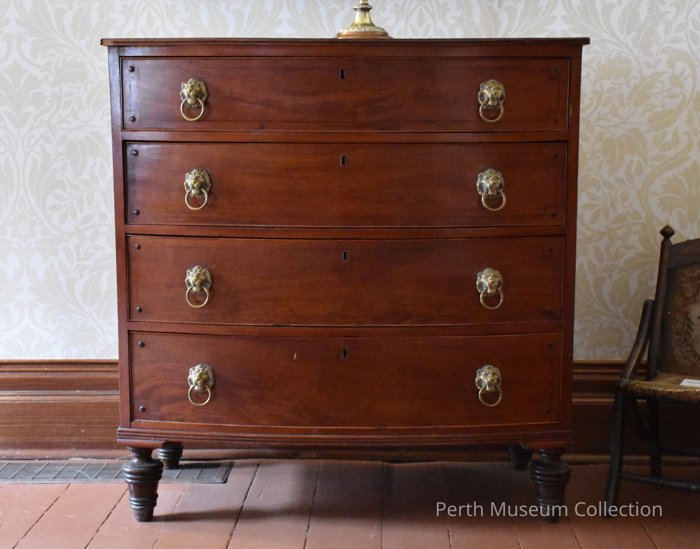 The image shows a vintage wooden chest of drawers with a classic and elegant design, featuring four spacious drawers adorned with ornate brass lion head handles and intricate detailing, standing on turned legs with a smooth, polished finish that enhances its rich, warm wood tone; beside it, part of an antique upholstered chair can be seen, resting on a wooden floor with a decorative patterned wallpaper background, evoking a sense of timeless sophistication and traditional charm in a cozy, inviting setting that suggests a historical or heritage-inspired interior space.