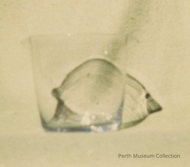 This is a handblown clear glass Georgina wineglass cooler/rinser. It has a ground pontil maker on the bottom, and bubbles and seams in the glass which mark it as handblown and very old. There are two small spout's on either side of the top, which held the foot of the wine goblet, while the bowl rested in the ice water to be cooled or rinsed. The glass has a slight bluish cast to it.