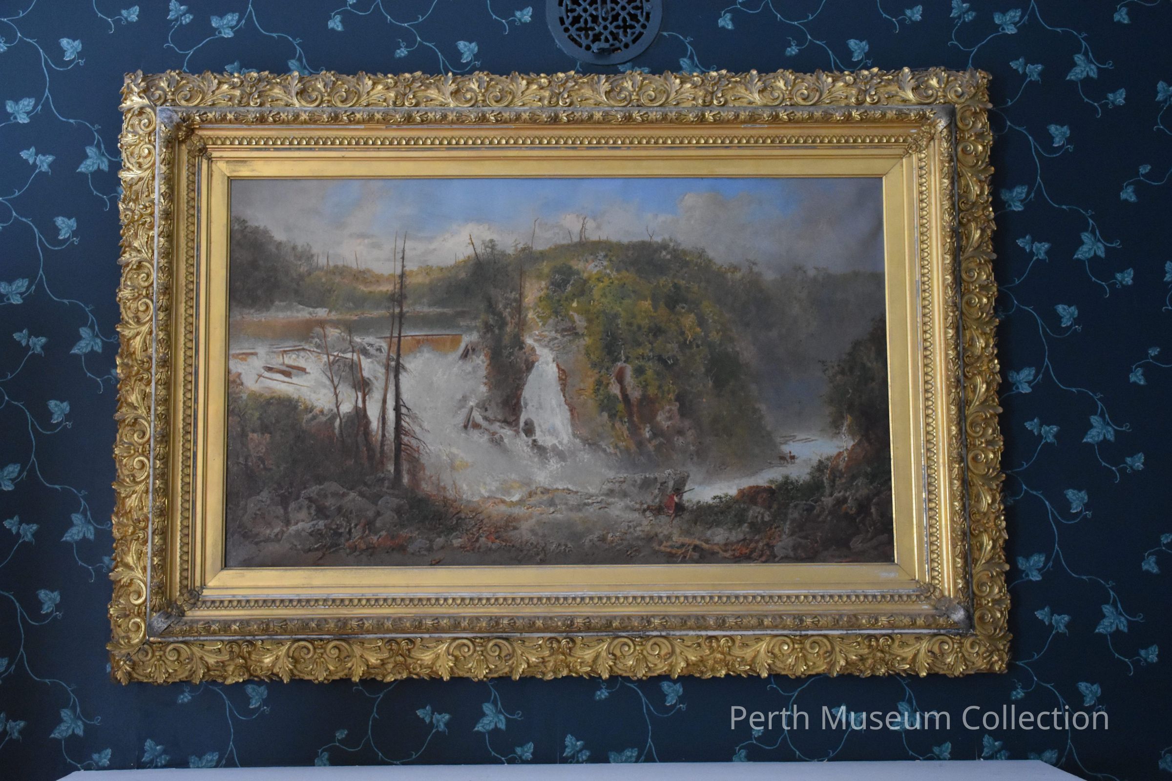 This romantic landscape of the Canadian school was painted in 1885 by O.R. Jacobi (1812-1901). The date and signature appears in the lower right side of the painting. The scene is a high water fall and rapids with a hunter in the left foreground stalking a pair of deer in the lower right corner. the painting is in very good condition and is in its original late Victorian frame, and extravaganza of baroque scrolls, flowers and leaves in plater and gold leaf. the gold leafing seems to be the old method of water guilding and is worn in a few spots down to a dull grey which in no way detracts from its impressive appearance.Inscription/Signature/Marks