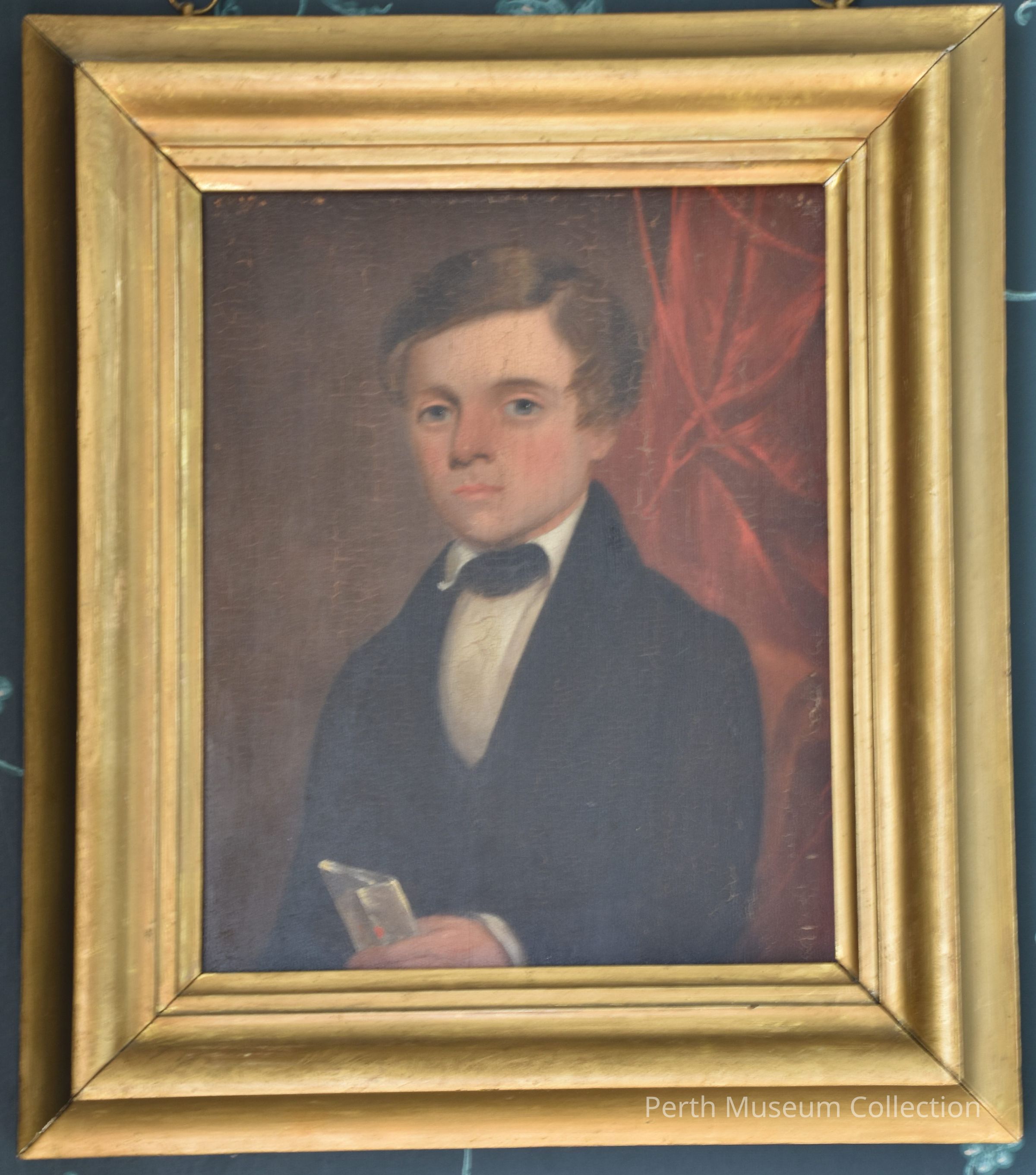 This is painted on a wooden panel (pine) and has the subject's name and the date on the back, burned into the wood. It is dated "Perth, U.C. May 1842, painted by W. Finsley". the frame appears to be the original and is gold leafed with later touch ups of gold paint, but not badly done. Roderick Edward stands in front of a red drapery, dressed in a sombre black suite with white shirt and black stock. He is holding a sealed letter in his left hand. the paint surface is a bit checked but on the whole it is in good shape. The two original metal hanging rings are at the top of the frame. Roderick Edward was the eldest son if the Hon. Roderick Matheson and his first wife (Robertson).