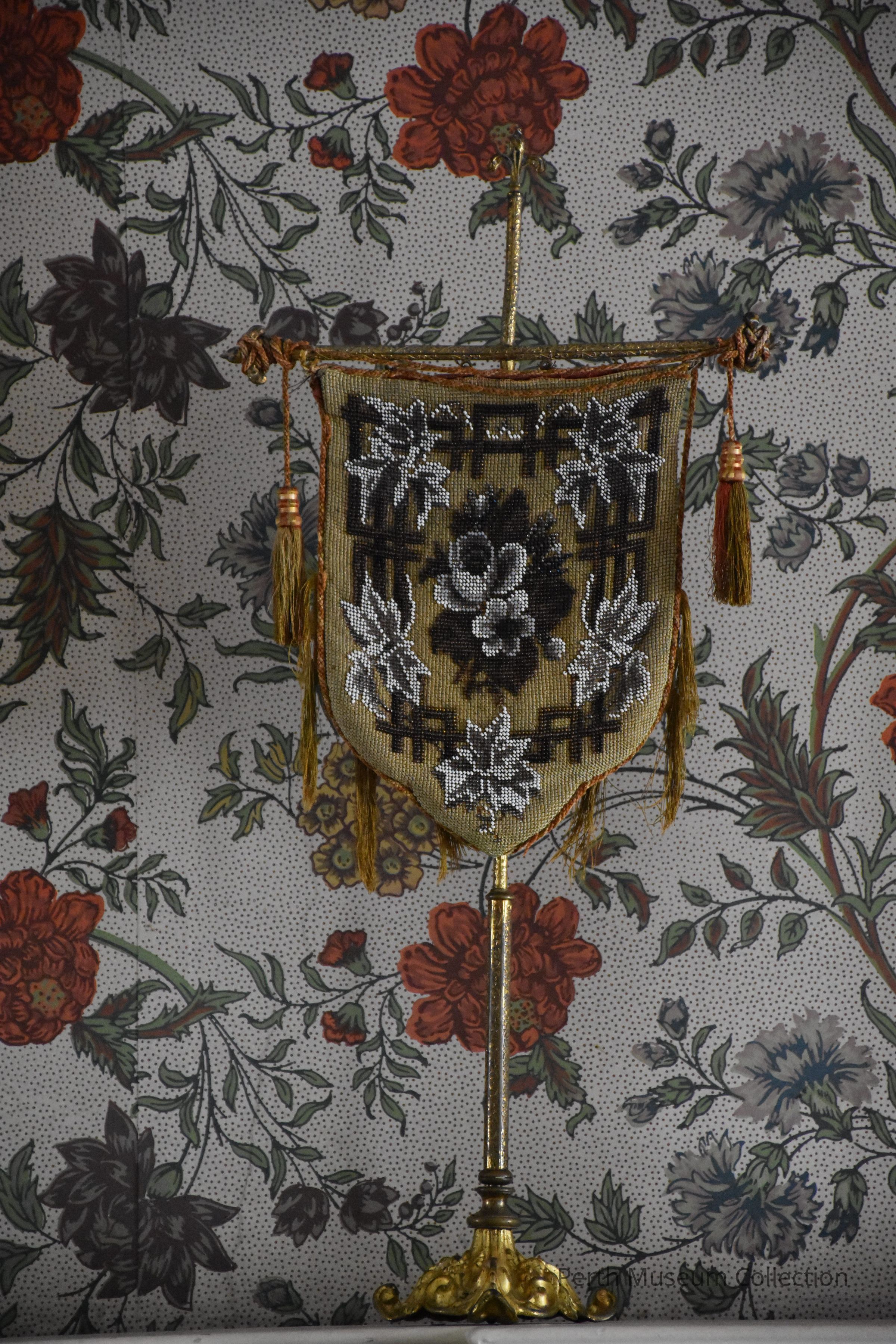 Two faded red and green tassels hang from the supports and the remnants of a fringe still survives. The needlework is in fairly good condition, but the backing silk is in tatters. The brass sections are in three pieces: the base, the screw-in flange and the support "T" which fits into the flange. The banners can be taken off their bases and held by hand, hence the name.