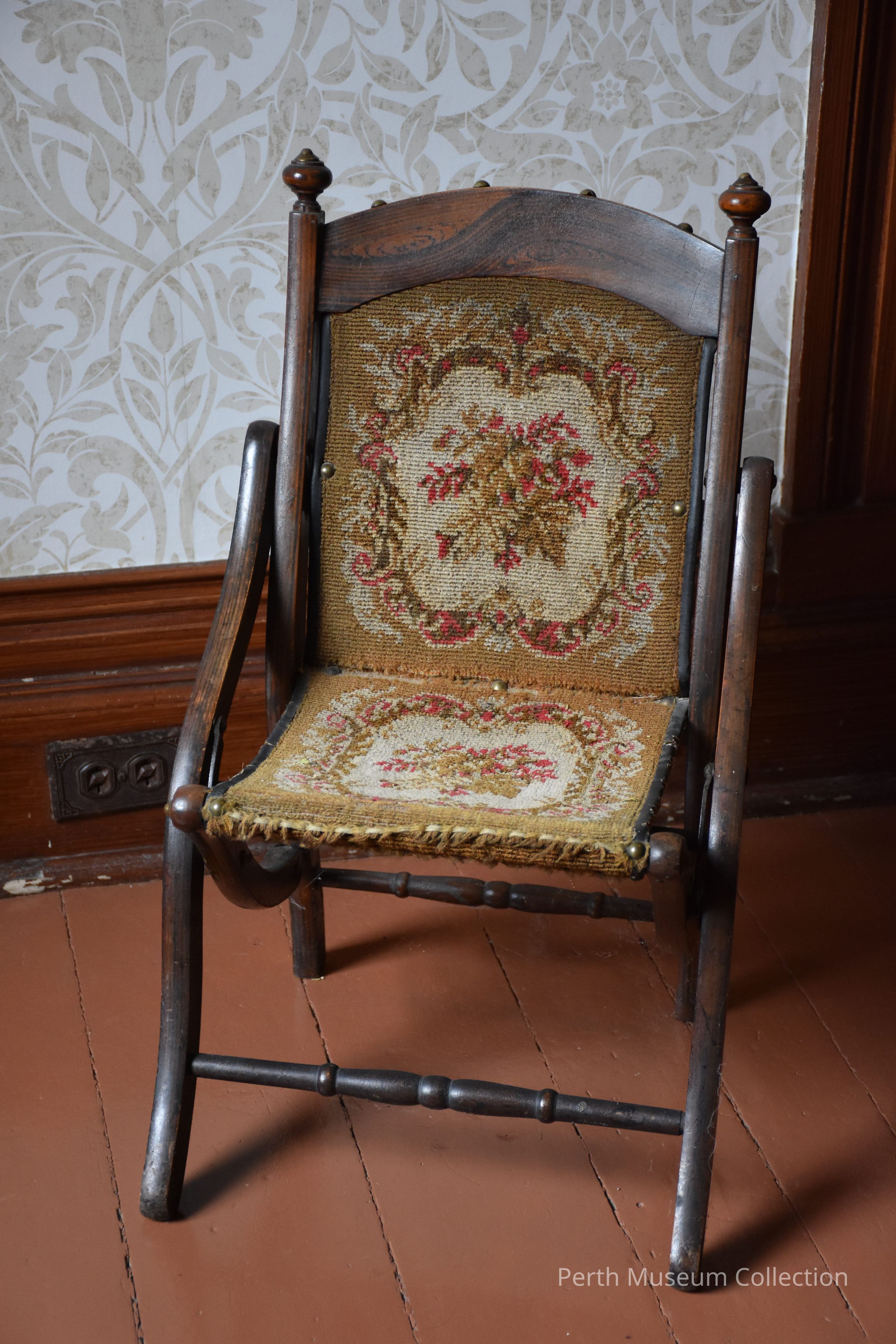 The frame of this chair is made of walnut and grained to resemble rosewood. The wood underneath the seat is pine. The chair folds up like a camp chair, and it is upholstered in Brussels weave carpeting, in shades of mustard, cream, brown and red. The remains of an original fringe hangs from the front of the seat.