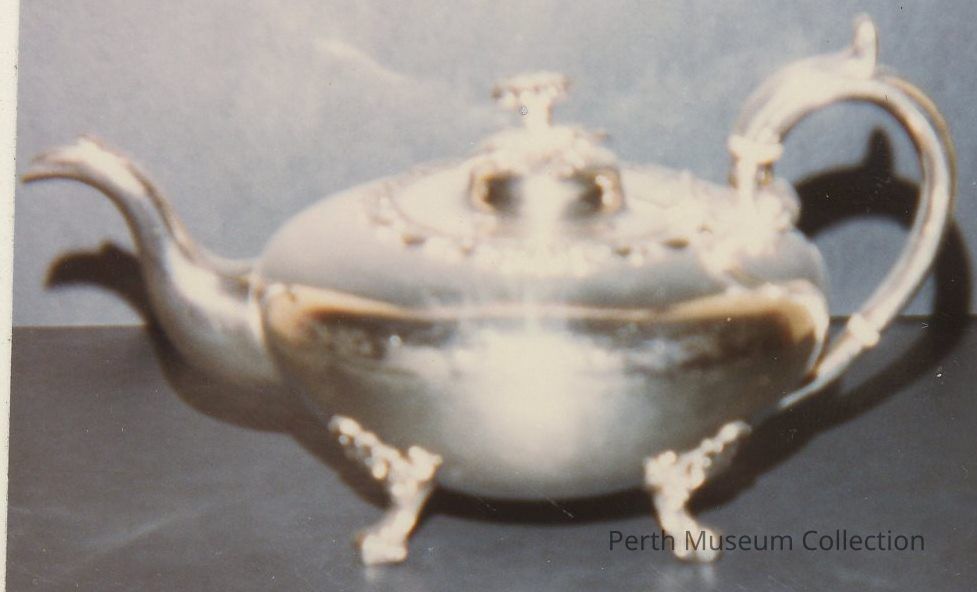 This silver teapot is part of a set which belonged to the Rev. William Bell, who came to Perth on June 24, 1817. It is in the revived Victorian Rococo style with a curved handle and spout, fancy paw feet, ivory bands on the handle, and scrollwork around the lid. The teapot is topped with a convulvulus flower which acts as a finial for the lid. The hallmark appears on the lid but it cannot be read because the mark was struck twice in the same spot.
