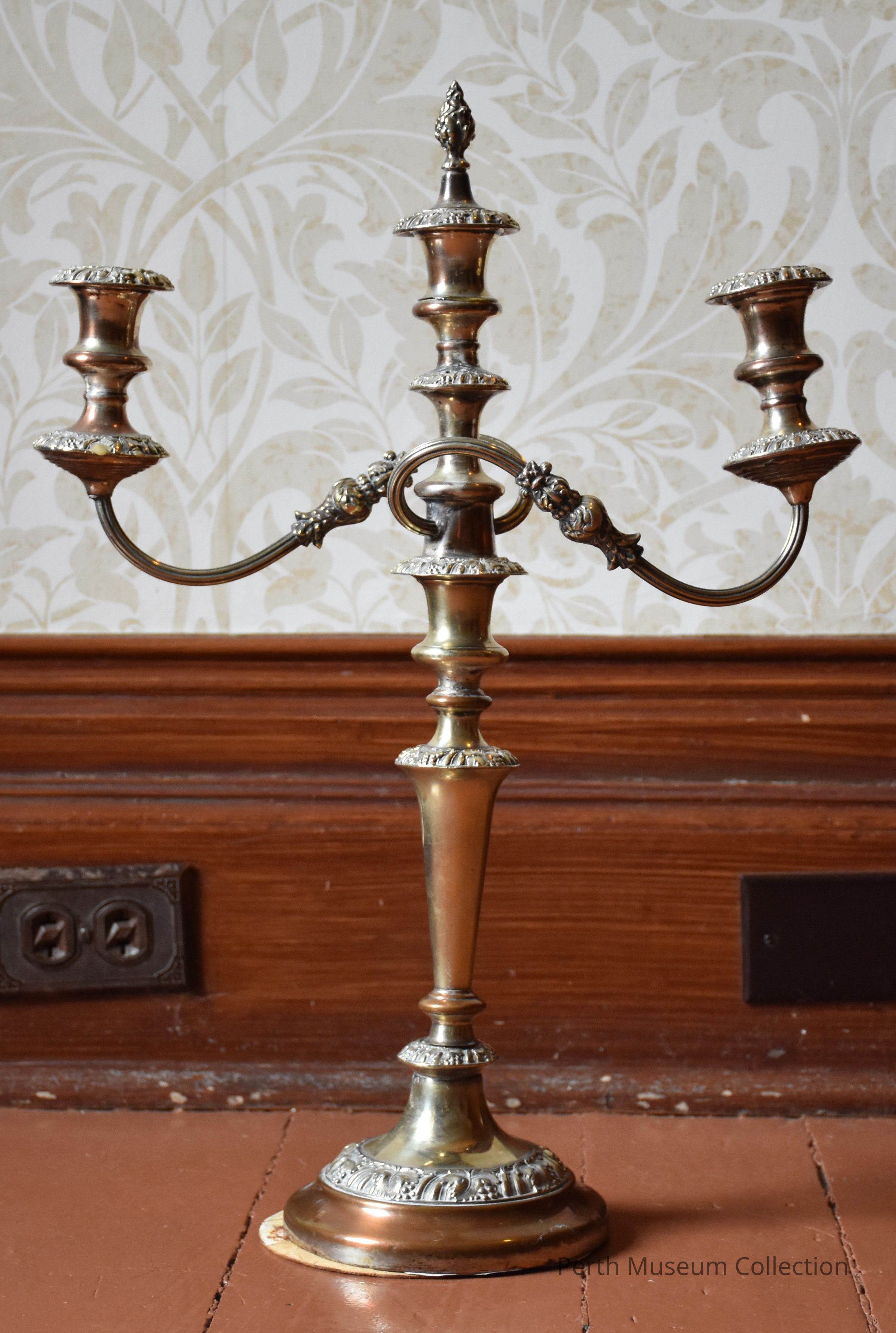 970.3.1 - Each candelabrum consist of 6 parts, a single candlestick into which a three branched holder fits, three individual decorated bobeches to catch the candle was drippings and a flame finial which fits into the centre socket if only two candles are required. The bases are round and decorated with an elaborate banding of a raised fruit and leaf design. The copper shows through on the flame finials, but not on the rest of the components as these have been re-silvered. Bases are covered with new gold felt which is removable for cleaning. Circa 1840.