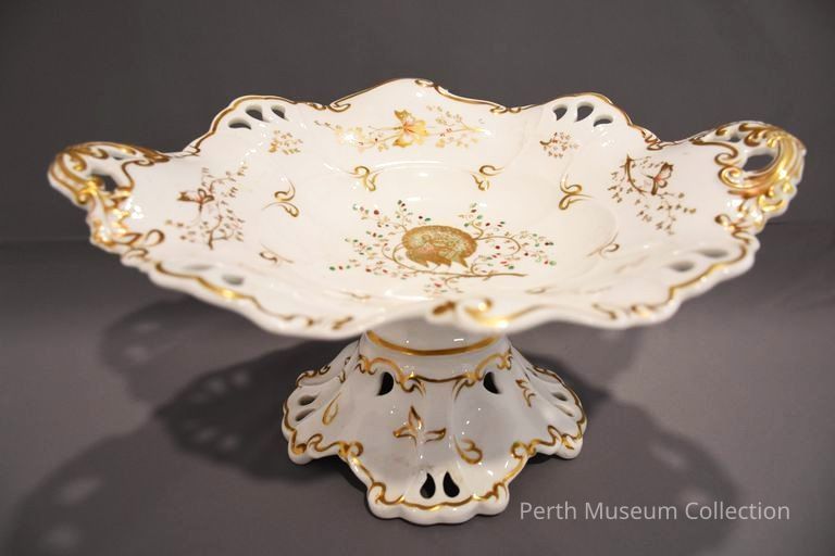 This footed fruit compote is one piece of a set of original Matheson china. It has a high pedestal base, the foot of which is pierced with teardrop holes. The dish is oval in shape and has a scrolled edge which is richly redecorated in gold leaf. It is decorated with a green, red and gold peacock in the centre of the dish with gold butterflies on branches around the top edge. It has two pierced, scrolled handles elaborately gilded, and four petal feet at the bottom. There are no identifying marks on this piece or on any other of this set, only the lot number of 3100. It is most probably English and is curiously heavy, probably Rockingham or Coalport China. the family legend that it is Nantgraw china is without foundation. Circa 1835.Dimensions