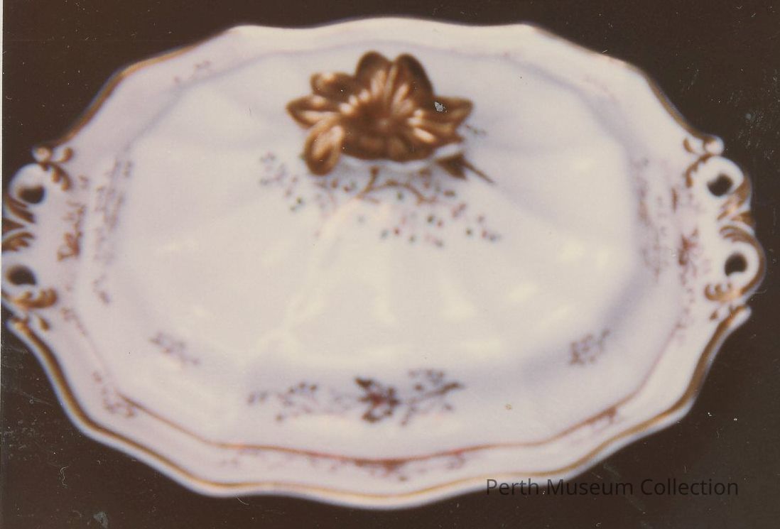 This covered vegetable dish is part of the 53 piece set of china originally owned by the Mathesons. It is a rather heavy white china, decorated in rich gold leaf. The dish has a peacock in the centre in red, green and gold, sitting on a flowering branch in red, green and gold leaves. the two pierced handles on either side are scrolled in gold and the edges have sprays of gold and red butterflies encircling the perimeter of the dish. The cover has the same design with the addition of a huge gilded flower which serves as a finial/handle to the lid. These two pieces are perfect with no repairs. the lot number 3100 is painted in red on the underside of the dish, no other identifying marks. Circa 1835.Dimensions