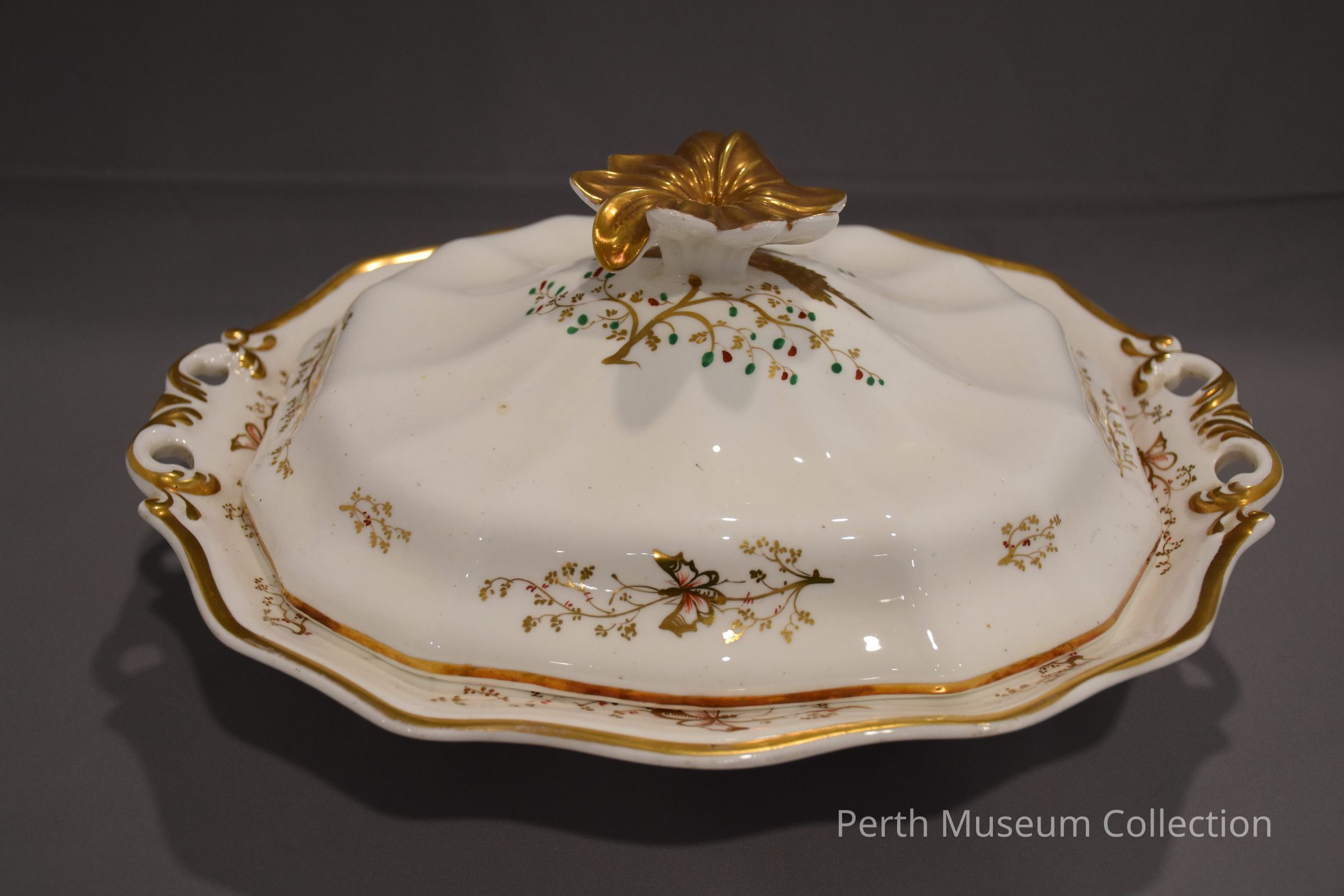 This vegetable dish is part of the 53 piece set of china originally owned by the Matheson family. It is a rather heavy white china, decorated in rich gold leaf. The dish has a peacock in the centre of the interior enamelled in red, green and gold, sitting in a flowering branch of red, green and gold leaves. The two pierced handles on either side are scrolled in gold and the edges have sprays of gold and red butterflies encircling the perimeter of the dish. The cover has the same design with the addition of a huge, gilded flower which serves as a finial/handle to the lid. These two pieces are in perfect condition with no repairs. The lot number 3100 is painted in red on the underside of the dish, no other identifying marks. Circa 1835.Dimensions
