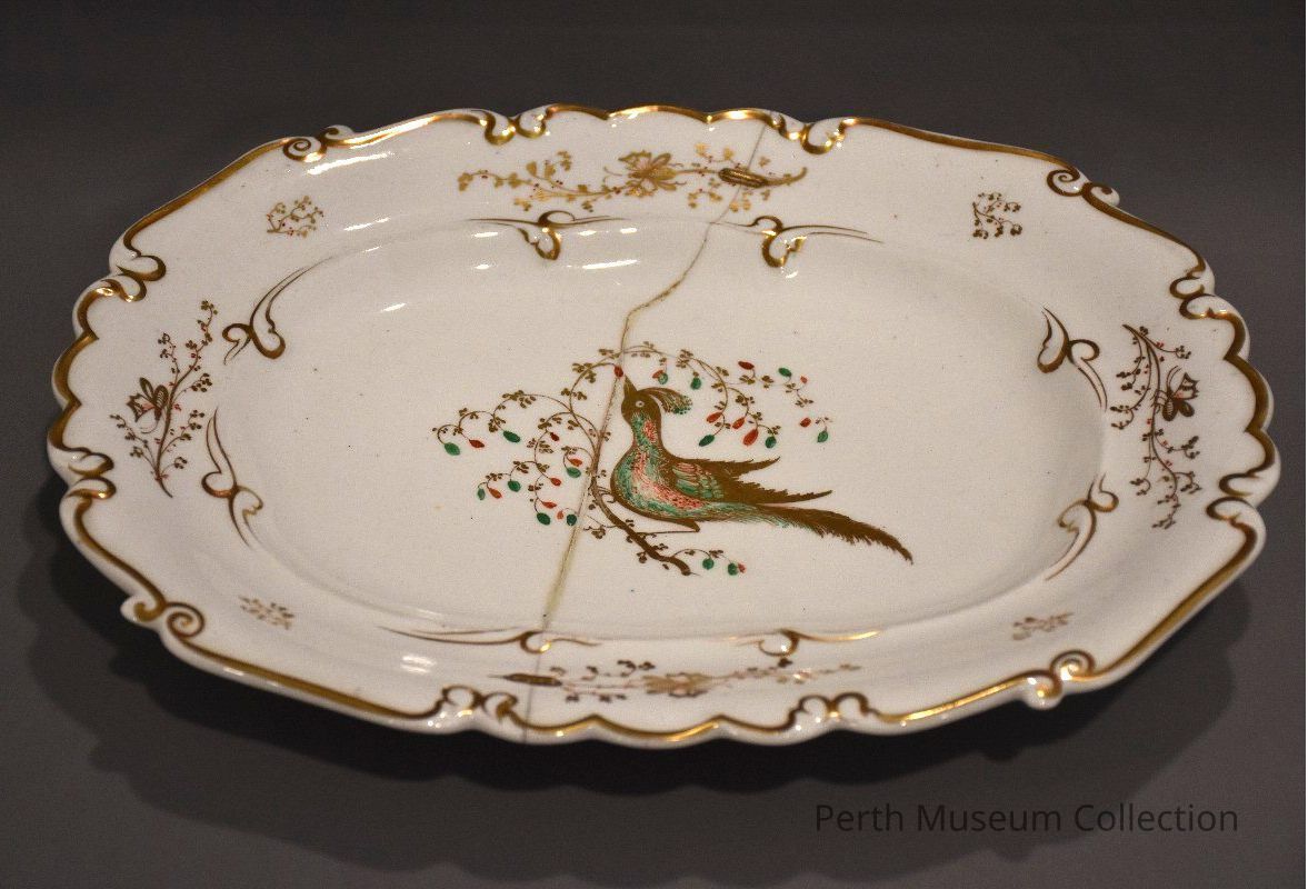 This small platter is one piece of a set of original Matheson china. It is of a rather heavy white china decorated in a rich gold elaf. A green, red and gold peacock is in the centre sitting in a flowering branch with red, green and gold enamelled leaves. The edges are scalloped and gold leafed in scrolls with an inner scrolled band. The border is decorated with red and gold butterflies on flowering sprays. This piece has been cracked completely accross the centre and has been repaired with two painted staples. This piece also has the 3100 number painted in red on the underside. Circa 1835.Dimensions