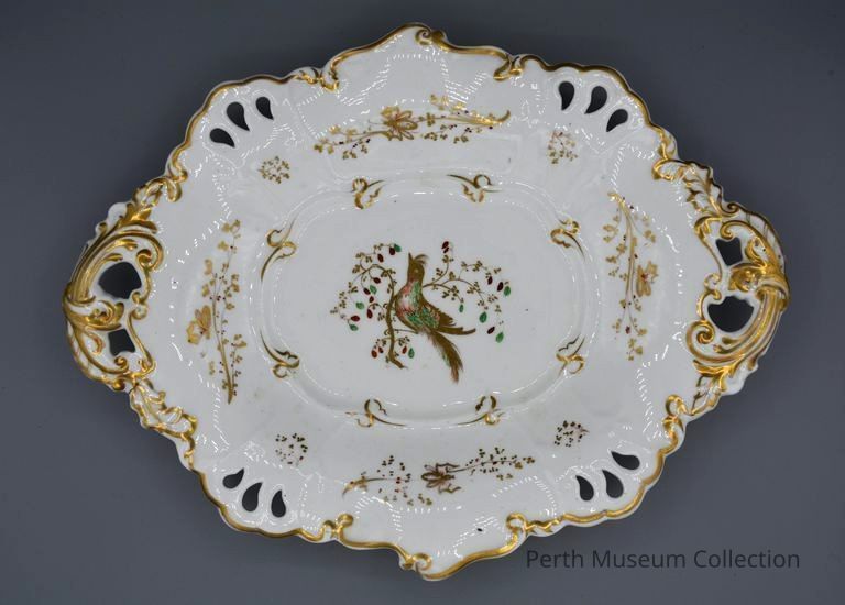 These sweetmeat dishes are part of the 53 piece set of china originally owned by the Matheson family. It is a rather heavy white china decorated in rich gold leaf. The edges are scalloped and elaborately pierced to give a lacy effect. The scalloped edges are decorated in gold leaf scrolling. the pair of scrolled handles are gilded with leaves and pierced to look applied. there is a border design of red and gold butterflies on gold flowering branches, very delicate. the central design of each plate is of a red, green and gold enamelled bird sitting in a red, green and gold enamelled flowering branch. The two pieces are in perfect condition and both have the number 3100 painted in red on the underside. Circa 1835.Dimensions