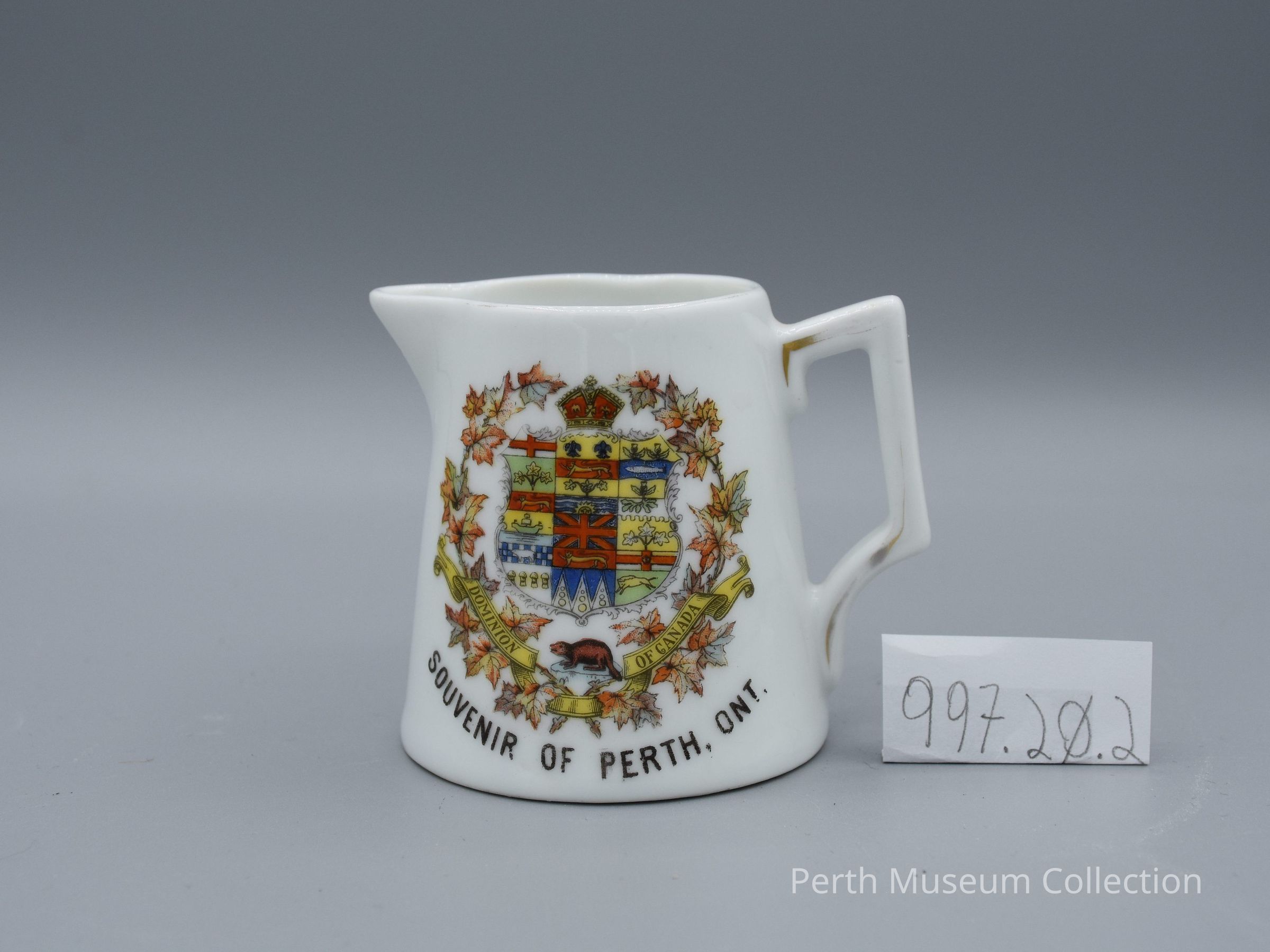The pitcher is made of white porcelain. The pitcher has a lip-spout and its handle is rectangular in shape with a gold coloured overglaze decoration line running down the handle on one side.The body of the pitcher is conical in shape, on one side it has coloured overglazed decorations, in the centre there is a Canadian shield surrounding the shield are maple leaves and under the shield there is a banner that says, "DOMINION OF CANADA" with a a beaver in the middle of it. Under all of this is printed, "SOUVENIR OF PERTH, ONT.". The base of the pitcher has a flat indentation. In "VICTORIA" above it and "AUSTRIA" below it.Dimensions