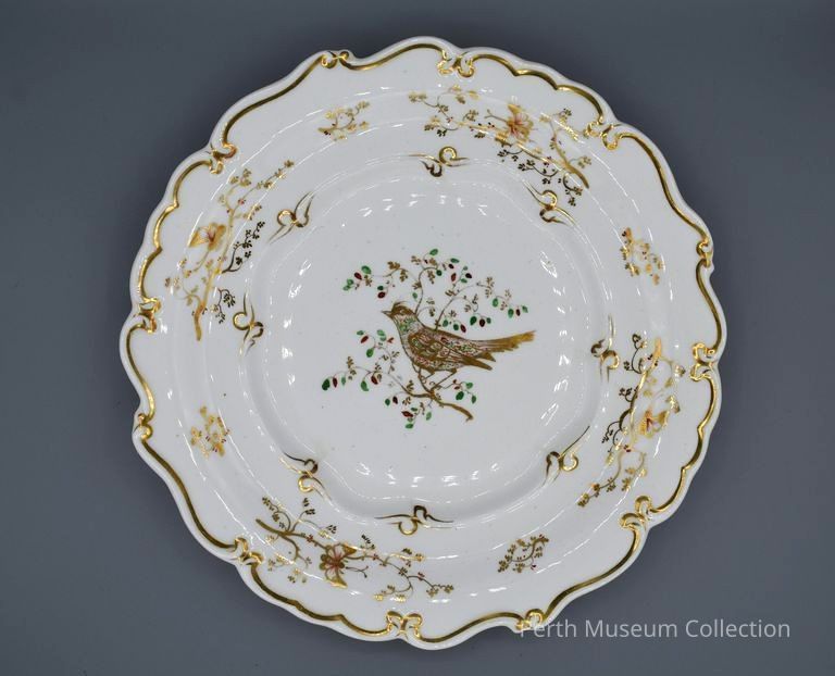 The image showcases an ornate, round porcelain plate with a beautifully scalloped edge, adorned with a delicate gold trim. At the center of the plate is an intricate design of a bird perched on a branch, with green and gold accents depicting the leaves and flowers. This central motif is surrounded by elegant floral patterns that echo the natural theme and are subtly highlighted with gold detailing. The overall aesthetic of the plate is one of refined elegance, reflecting a harmonious blend of artistic craftsmanship and decorative sophistication.