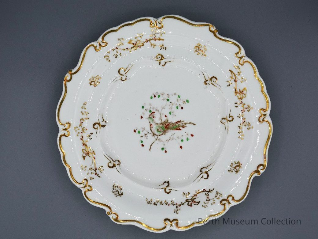 These pieces are from the 53 piece Matheson family china. They are of a rather heavy white body decorated in rich gold leaf. The edges of each plate are scalloped and decorated with gold scrolls. The borders are decorated with gold and red butterflies perched on gold flowering branches about the perimeter. The central design in all these plates is of a red, green and gold enamelled bird sitting in red, gold and green flowering branch. Each bird is slightly different yet similar to make a cohesive whole. All are in perfect condition and bear the red painted number 3100 on the underside. Circa 1835. No other identifying marks can be found.Dimensions