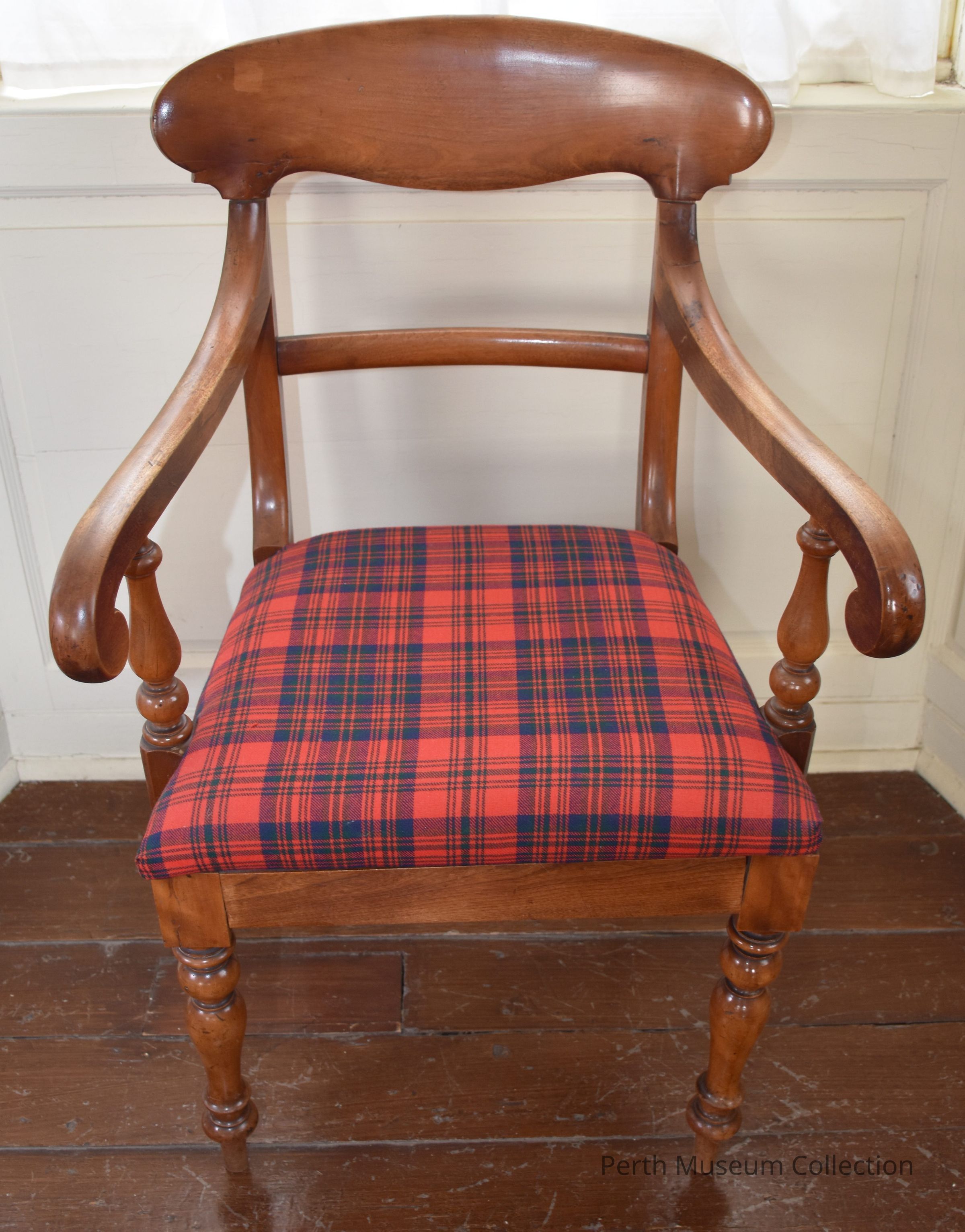 This image depicts a classic wooden chair with elegantly curved backrest and arms, featuring a seat adorned with a vibrant tartan, red and black checkered pattern, set against the rich texture of polished wooden legs, positioned on a wooden floor with a cream-colored wall in the background with a window above creating a sophisticated yet cozy ambiance that combines traditional craftsmanship with a hint of modern comfort, ideal for both formal and casual settings while exuding warmth and style.