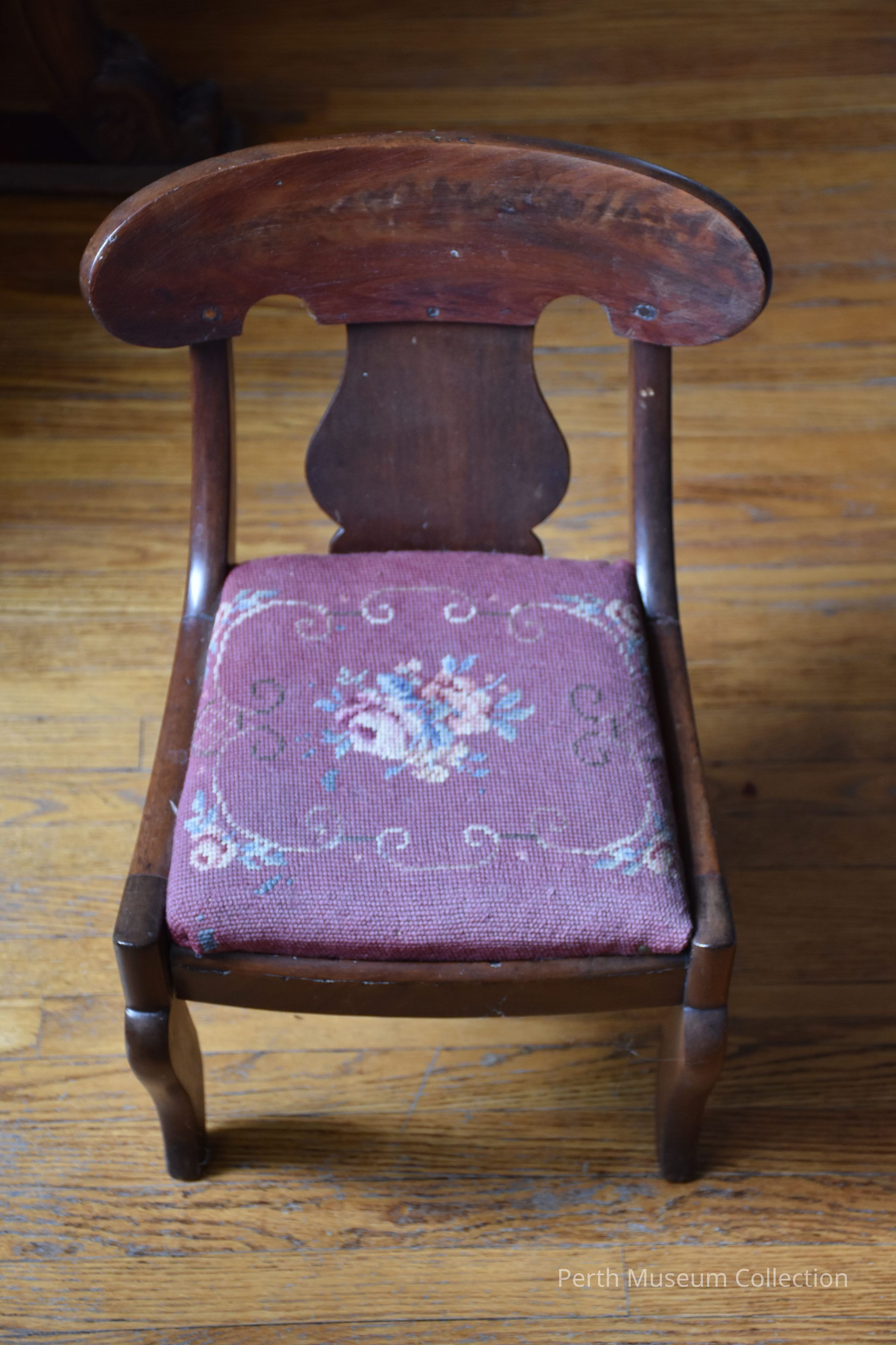 This charming miniature chair is made of mahogany with a slip seat covered in needlepoint. It may have been made for a child or as a salesman's sample. It is in the classical style popular in the 1820's, 1830's and up to the early 1840's. It has the regency curved legs front and back. There is a roman number VII crudely carved on the bottom frame of the slip seat. The needlework of the seat is of pink roses and blue forget-me-nots against a wine red background. The top crest has been repaired and refinished. Circa 1840 or a bit before.Dimensions