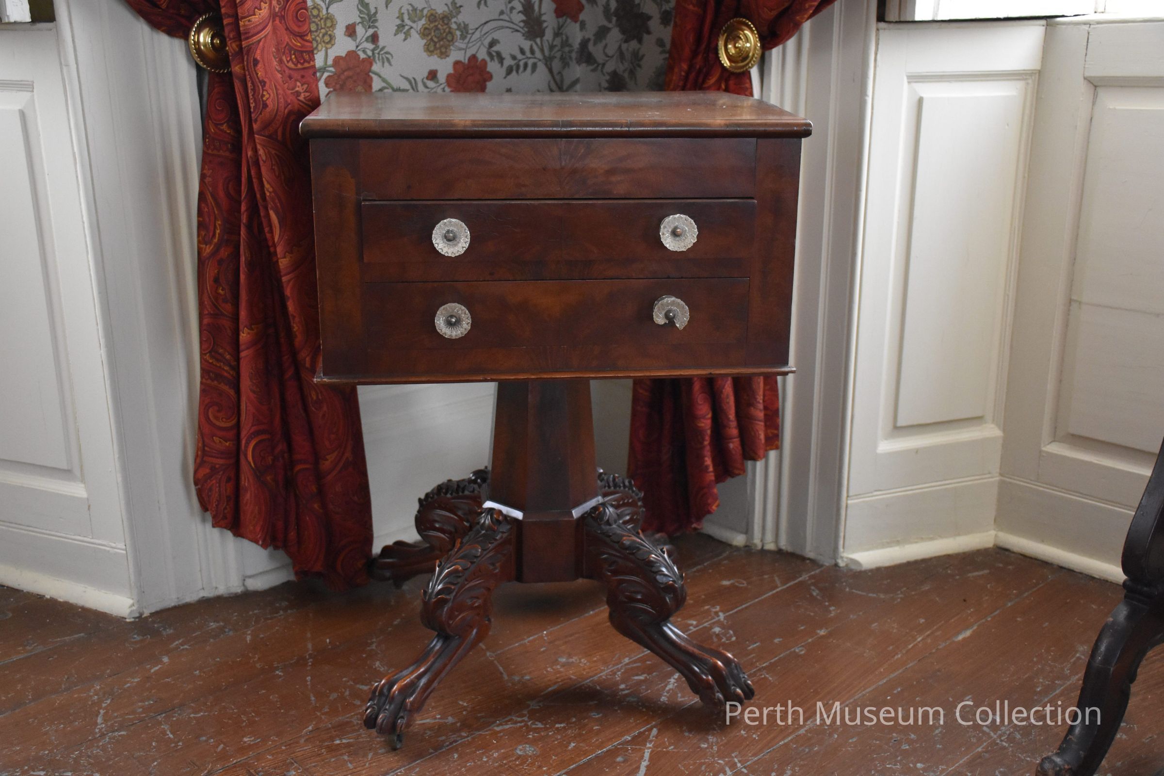 This mahogany table has two drop leaves on either side with pull out support brackets. It has a square pedestal support base which rests on a plinth with four scroll-shaped feet with metal castors. It has two drawers with key hole escuthcheons. It is of solid mahogany on top with veneer on the base and feet. the veneer on the scrolled feet is lifting and is in bad condition. It is in the classical revival style popular in the late 1830's and early 1840's. The lower drawer is separated into four compartments for sewing supplies. This table was bought at auction in 1970 by Mrs. Inderwick because it is very similar to a table once owned by the Mathesons. the top swivels on the base to provide greater flexibility in use as it is moved from place to place on its castors. Circa 1840.Dimensions