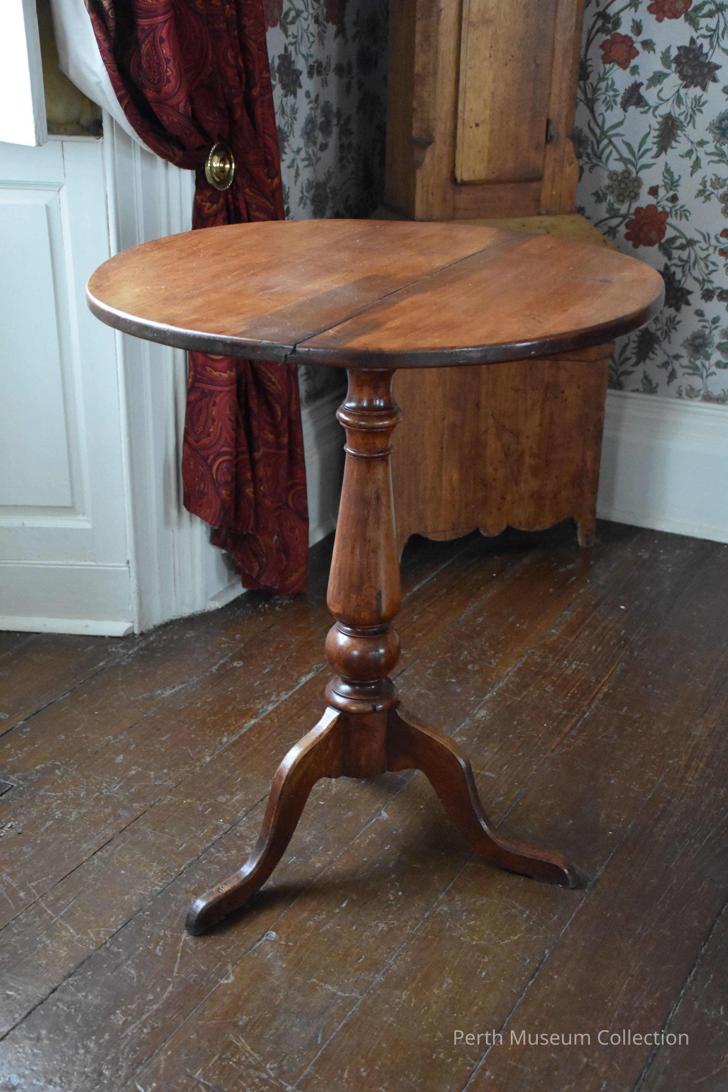 This table has a tripod pedestal base of mahogany and a tilt top. The top seems to be of an "inferior" wood, stained with a reddish stain to match the base. It has a wide crack across the top where the two boards were joined. The under supports of the top are of oak and it has a brass fastener to keep the top locked when it is down. This is supposed to have come from Scotland and is quite early. It has a reddish stain which has worn off in places. Circa late 18th or early 19th century. This table was bought at auction in 1970 by Mrs. C. C. Inderwick for the museum.Dimensions