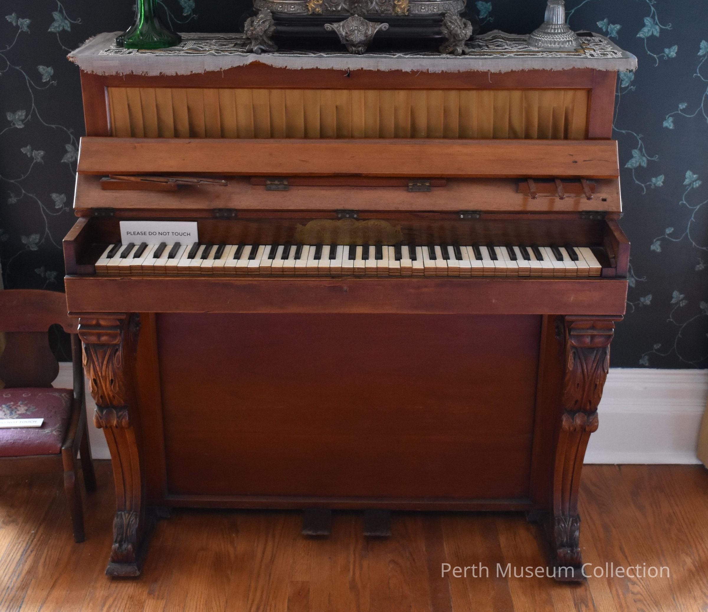 This fine early Canadian piano is made of faded mahogany, with a birds eye maple sounding baord and a rosewood panel above the keyboard. The top lifts up completely, and the vertical stringing is hidden by a panel of pleated gold rayon in place of the original silk. One key has lost its ivory veneer and the sounding board is badly cracked. It has two folding candle brackets on either side of the keyboard, the left one has been repaired with popsicle sticks and new screws, but the right one is completely original. The keyboard is supported by two elaborately carved, curved "corbels" ornamented with rosettes and acanthus leaves. It has two pedals and the lock is missing at the front. The back panels have been removed and are pine framework covered in black broadcloth. The date "August, 1837" has been burned into the back of the piece. the original maker's label still exists above the keyboard. It is of brown paper, elaborately scrolled in gold penwork and bears the legend: "New Patent, Frs. Milligan Pianoforte Makers, Couillard St., Upper Town Quebec". It spans 5 complete octaves.Dimensions