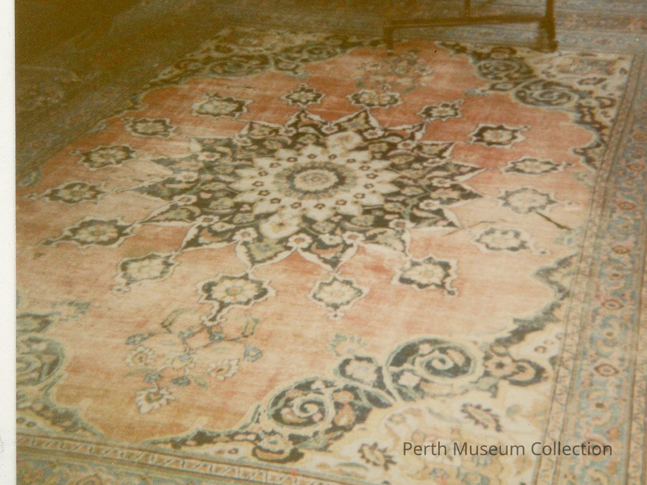 The image depicts an ornate rug with a large, intricate central medallion design featuring symmetrical floral patterns and complex geometric shapes, primarily in shades of dark blue, black, and cream, set against a muted red background. The border of the rug is adorned with smaller motifs and a repeating pattern, contrasting the more elaborate centerpiece. The wear and slight discoloration of the rug suggest age, adding to the vintage aesthetic. Dim lighting enhances the warm tones, contributing to the overall antique feel of the scene.
