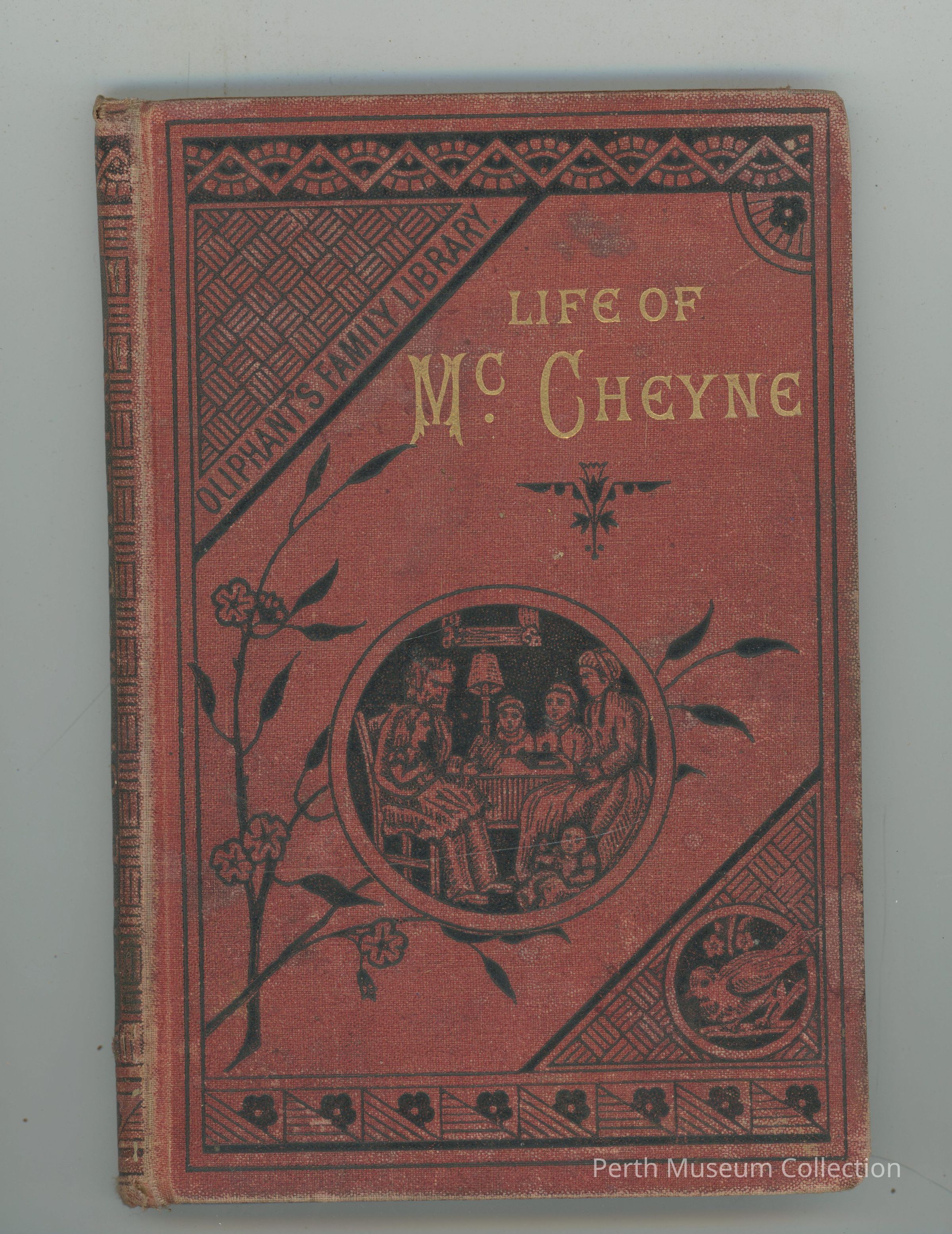 Old Description: This book has a red cloth hard cover decorated in black with a roundel depicting a family reading at at table, a pray of flowers and a bird in the lower right corner. It is divided into decorative areas and bears the information "Oliphant's family library" and the title in gold. On the inside cover it bears the lable of the upper scotch line sabbath school library, No. 6 and on the facing page it bears the lable of the Allans Mills Mechanics Institute Library, class R, no. 6. It was published in Edinburgh by Oliphant, Anderson & Ferrier and in London by Hamilton, Adam and Co. in 1882. It is a religious treatis on the memoirs of the Rev. Robert Murray M'Cheyne, minister of St. Peter's church, Dundee. There are many preserved maple leaves scattered throughout the book.