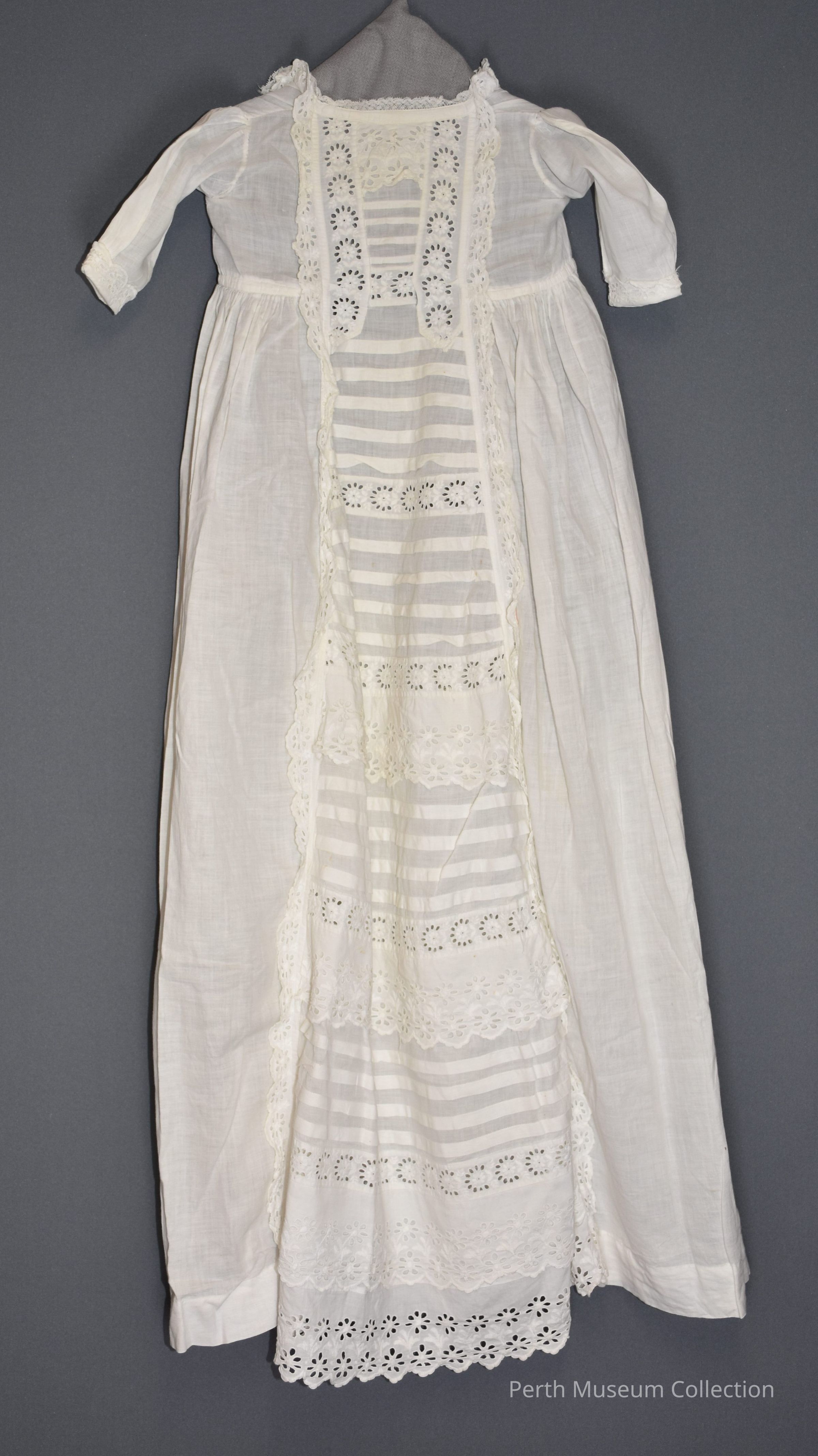 Delicate white lawn cotton with lace on bodice and cuffs and rows of lace and tucking down the front of the gown.