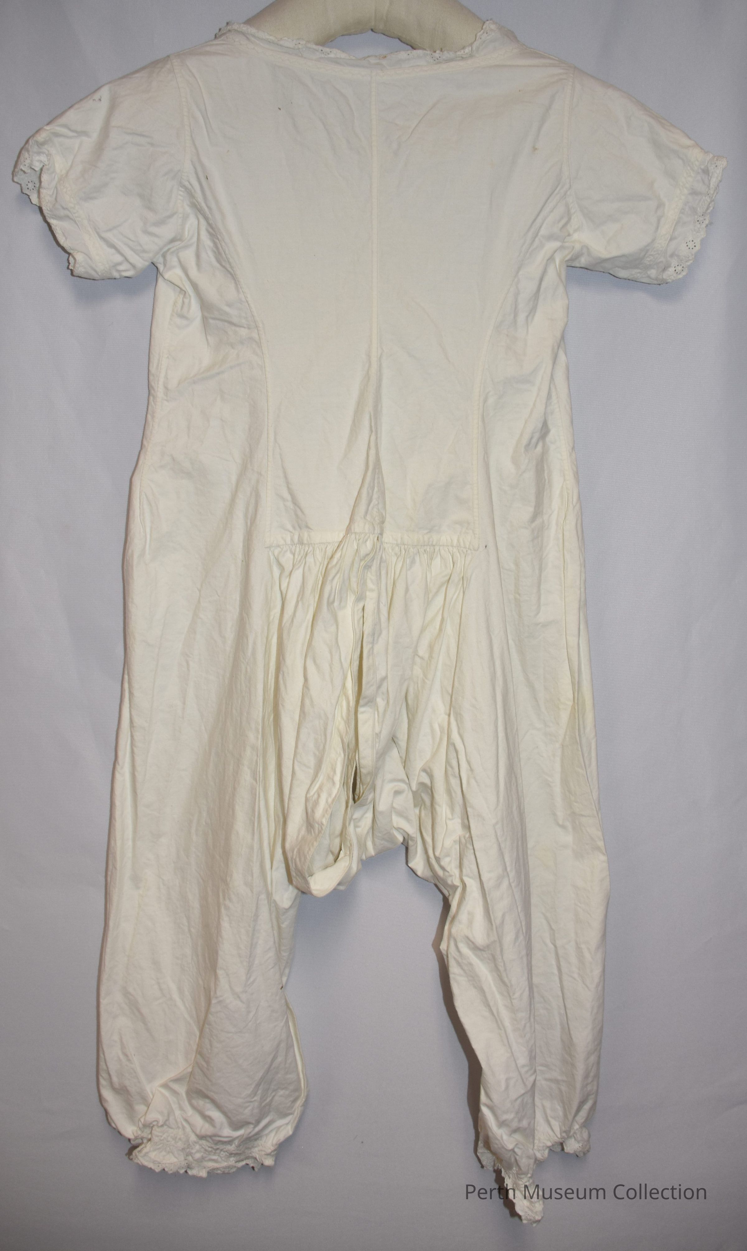 White cotton pantaloons with open crotch and two covered buttons closure at waistband. 5 1/2cm wide band of cotton eyelet lace sewn onto hem at bottom of each leg. Hardly worn.