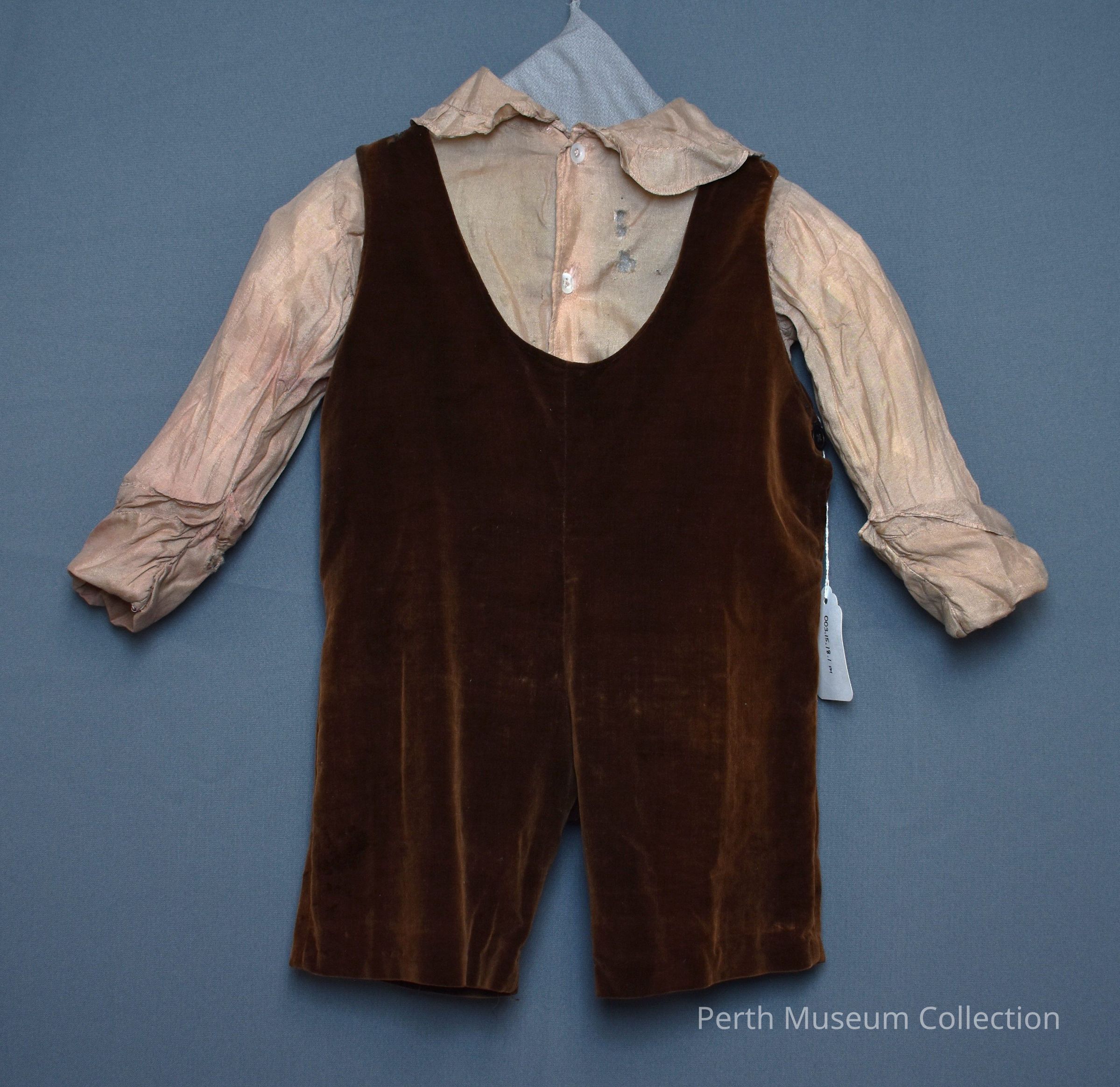 This is a young boys velvet suit from 1930 or 1931. The material is a medium brown colour and has a slight shine to it. The entire piece has been sewn with black thread. The bottoms of the legs are hemmed approximately 3/4" from the bottom. There are seams running directly down both the front and back as well as both of the sides. Underneath each of the arm-holes there is a 3 3/4' slit with a black button closure at the topin order to allow for easy dressing. There is a deep rounded neck at both the front and the back. The top of the shoulders are not sewn but rather held-together by black buttons identical to those used on the sides. The suit is in good condition, although there is some black thread that is beginning to come out of the seams.Dimensions