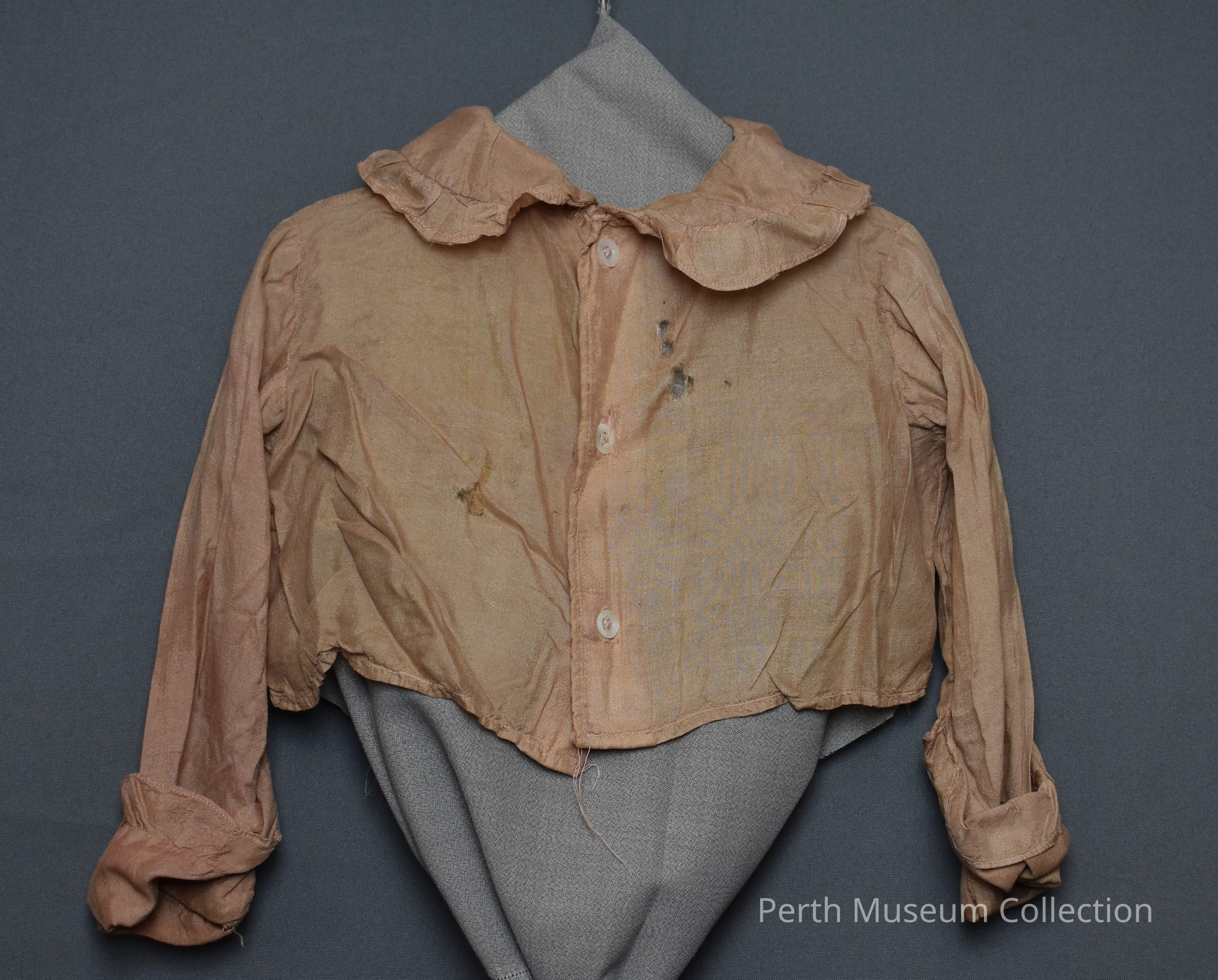 This is the shirt that is meant to be worn under 003.15.18.1. It is made of a very thin, beige-coloured material. There are 3 1/4" cuffs on the arms and on the top of the shoulders there are black buttons used to hold it to the suit. There are three white buttons down the front, held in place with peach thread, (like the rest of the shirt as well). There is a large collar at the neck. The arms are very wrinkled and there are several holes in the front.