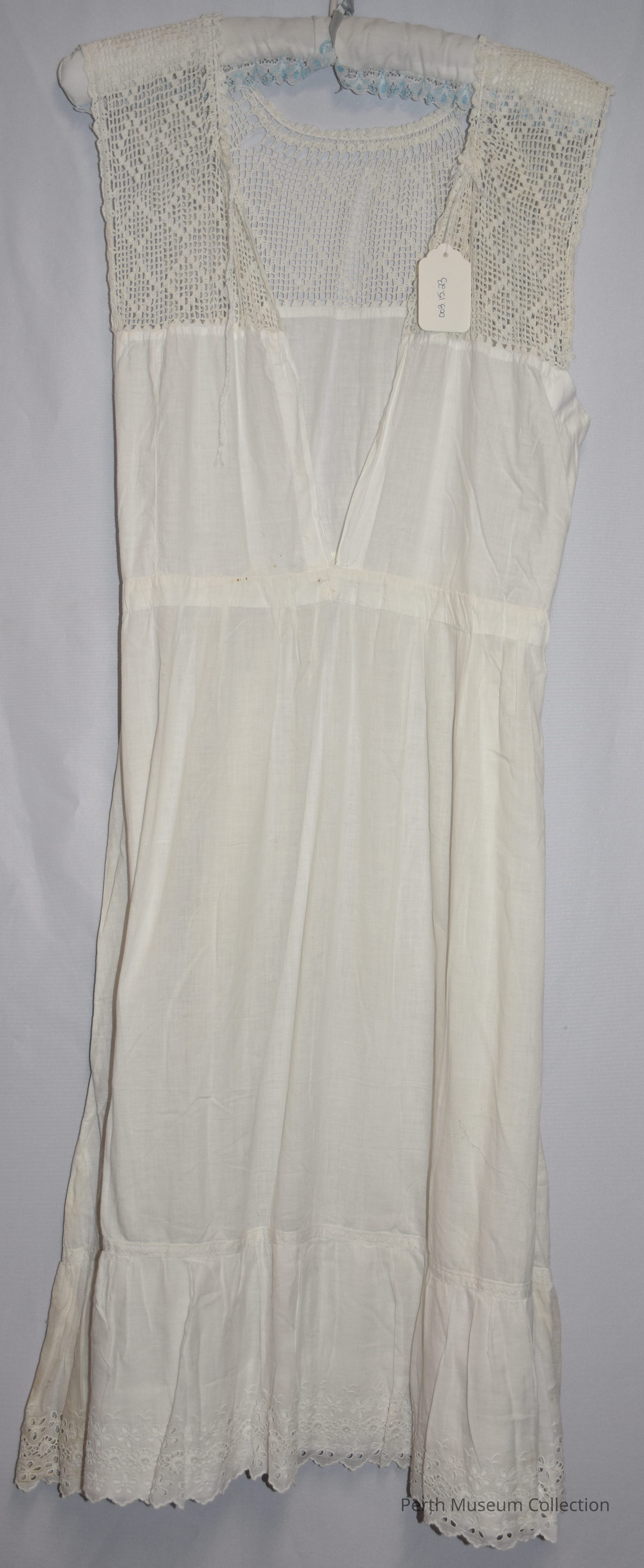 White cotton night gown with crocheted cotton and upper bodice. Sleeveless with drawstring at back of neck. Skirt hemline has lace eyelet trim with flower pattern. Few holes in skirt and hole in crocheted part at neckline.Dimensions