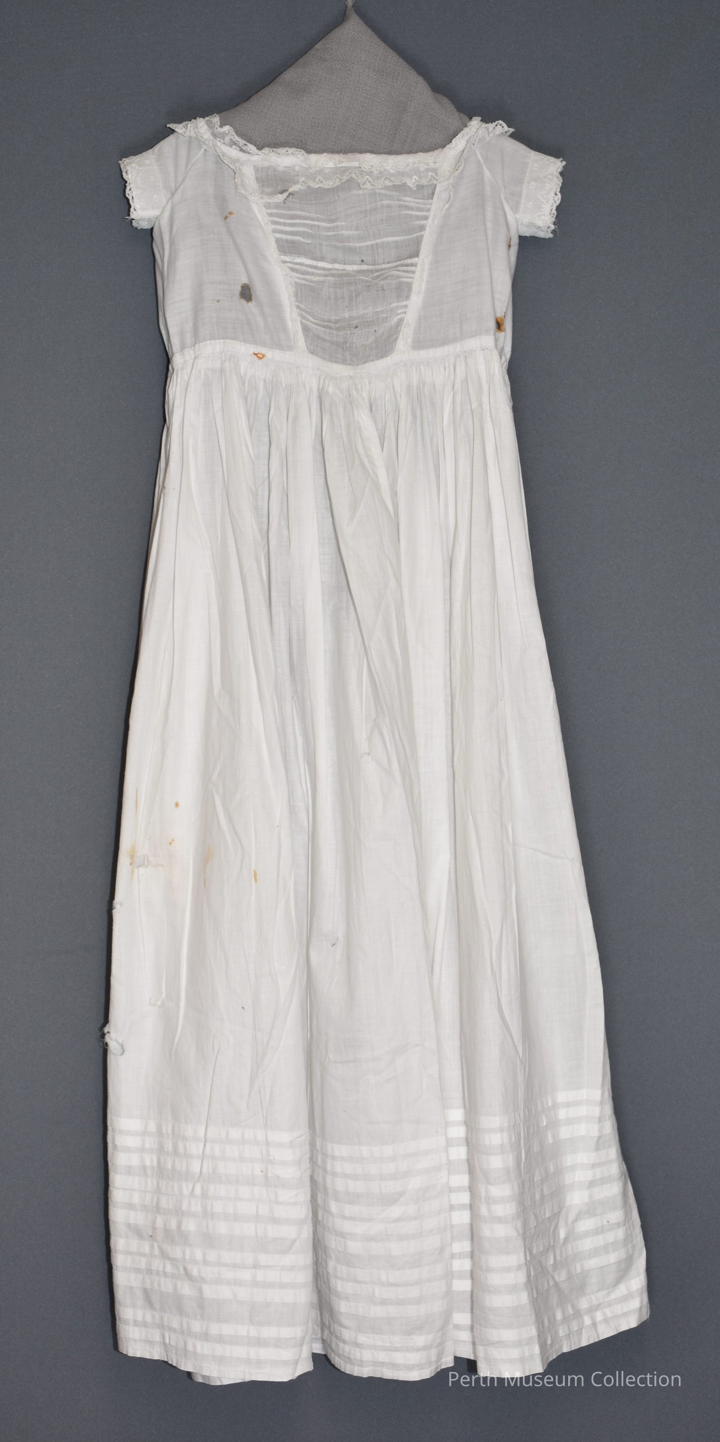 This is a long white baby's nightgown. There are two pieces of 1" wide lace that has been sewn along the neckline. There are short arms which are trimmed with the same white lace. There is a portion across the chest which is made of a thinner white material. There is also very thin lace bordering this section. The bottom portion of this nightgown is gathered at the waist and eleven stripes at the bottom. (where the material has been folded and sewn in horizontal strips). There are two white ties knotted at the back to close a 14" opening. The nightgown is damaged a little bit. There are some holes in the fabric and same orange discolouration. The lace trim is also in very bad condition.Dimensions