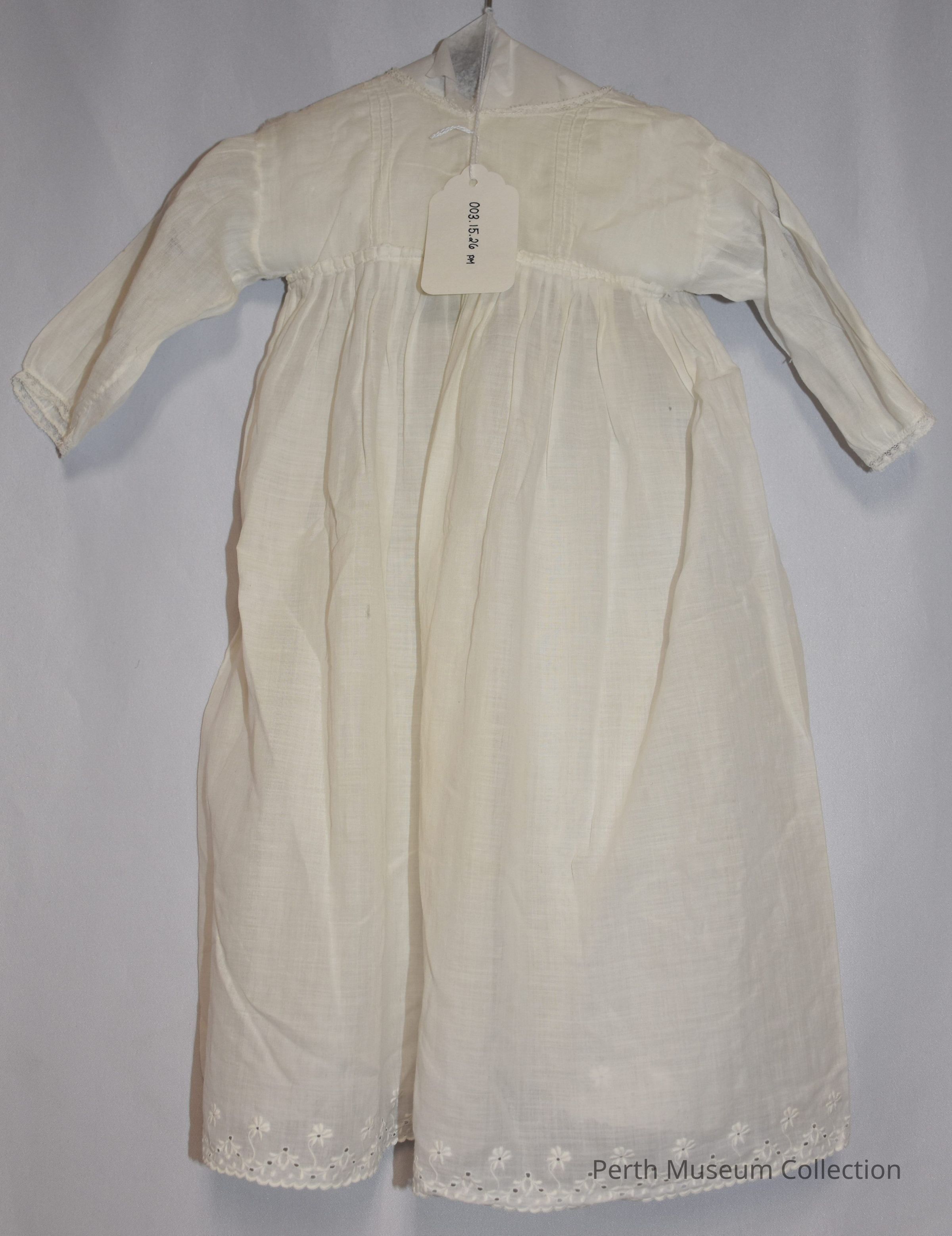 This is a small white baby's nightgown. There is thin (1/4") lace at the neckline as well as at the cuffs of the 7" arms. There is a single plastic snap at the base of the neck that closes the back. The material from the skirt portion is gathered at the waist. There is small white embroidery of flowers and leaves along the bottom edge.