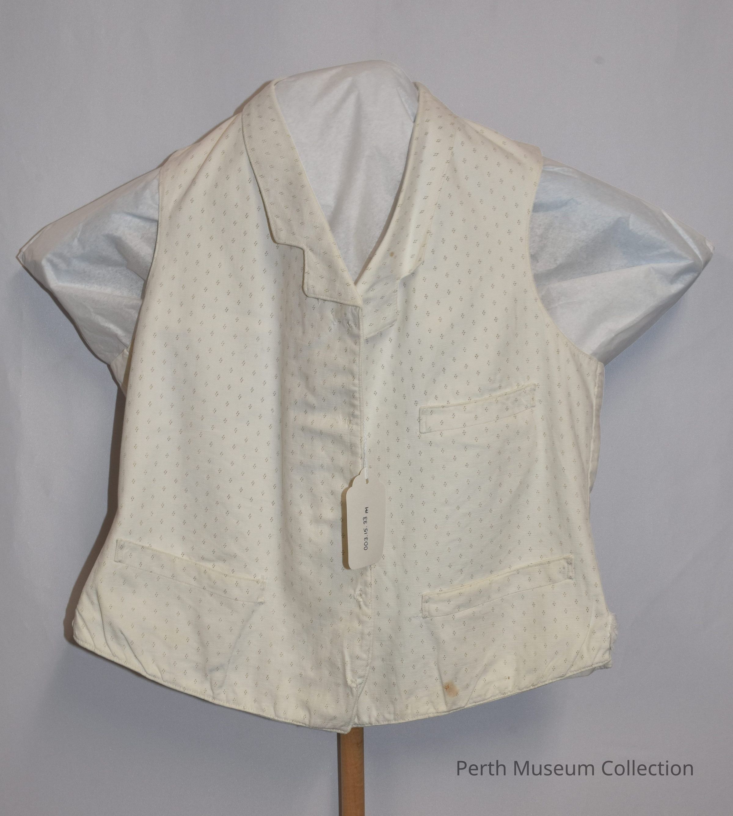 This is a white men's cotton vest, There is a small pattern on the front that consists of small brown dots. There is a rectangular pocket on each side at the wais. There is also a smaller square shaped pocket higher up on the chest on the left hand side. There are five button holes going up the front however all of the buttons are missing. The collar is a v-neck and is approximately 1 1/2" wide. The back is also white although it is not patterned. At the waist, at the back ther is a strip of cloth on either side thqt could have been pinned toghether to tighten the waist. The one ont he rightr is ripped. The vest is in good shape aside from the small rips, the missing buttons and some slight discoloured spots.Dimensions