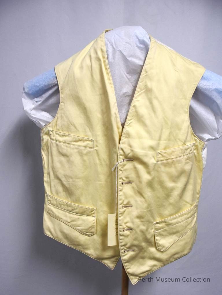 Men's cotton vest. Front of vest is yellow, back of vest is white. No collar at neckline. There are holes for five buttons, but no buttons present. There are four pockets, 2 on each side, smaller pockets are higher on the vest.