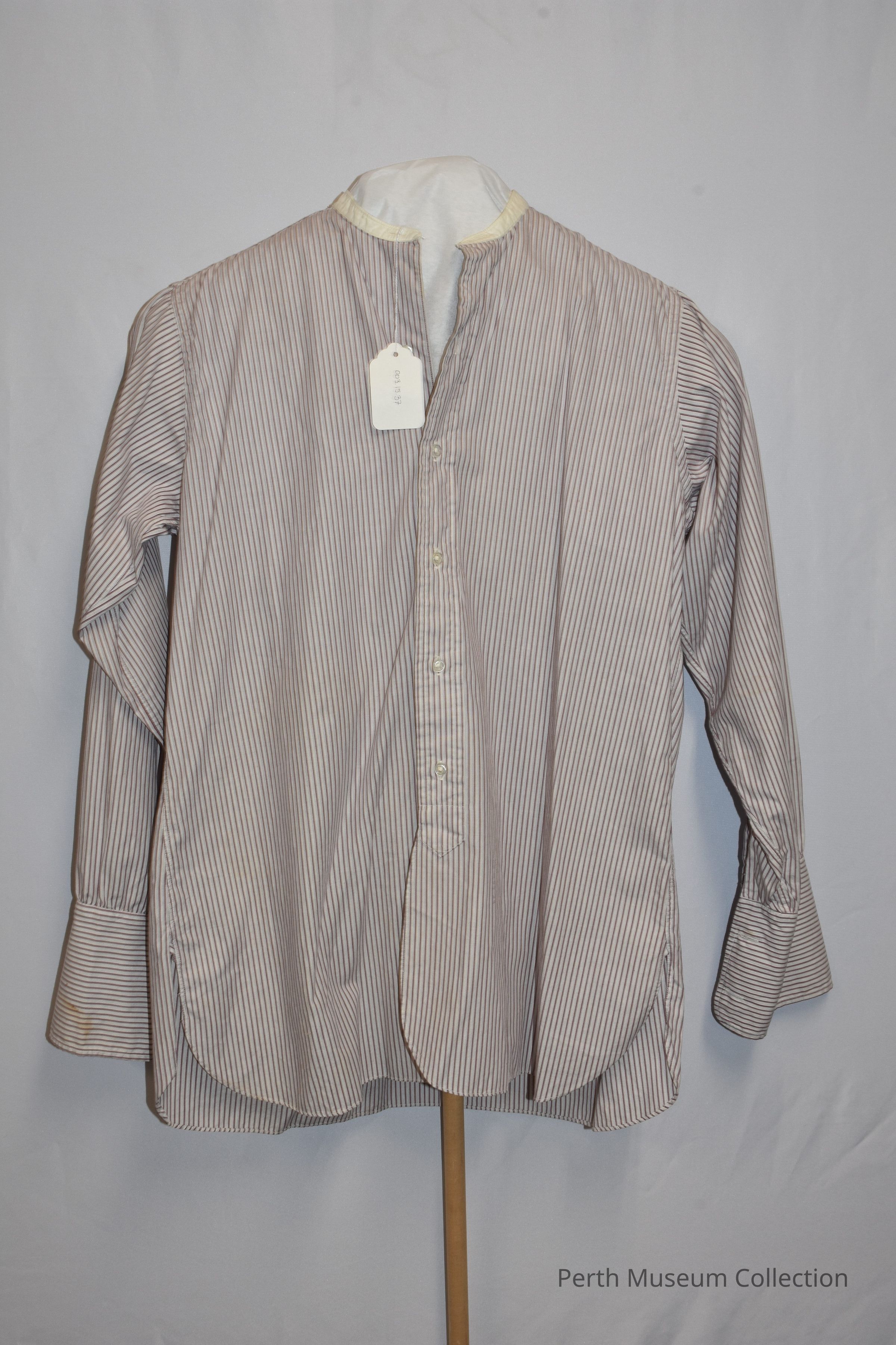 Men's cotton shirt. Vertical striped pattern of red, grey and white. Small white rounded collar. 5 button down the front. Large cuffs with 2 cufflink holes. Imprint on inside of collar reads: "15 1/2, 4". Tag on inside of shirt reads: "JACK HENRY, COUNTRY CLUB PLAZA, KANSAS CITY". There is also a tag reading: "W. GARFIELD EATON". Could be the original owner or donor to Montgomery House.Dimensions
