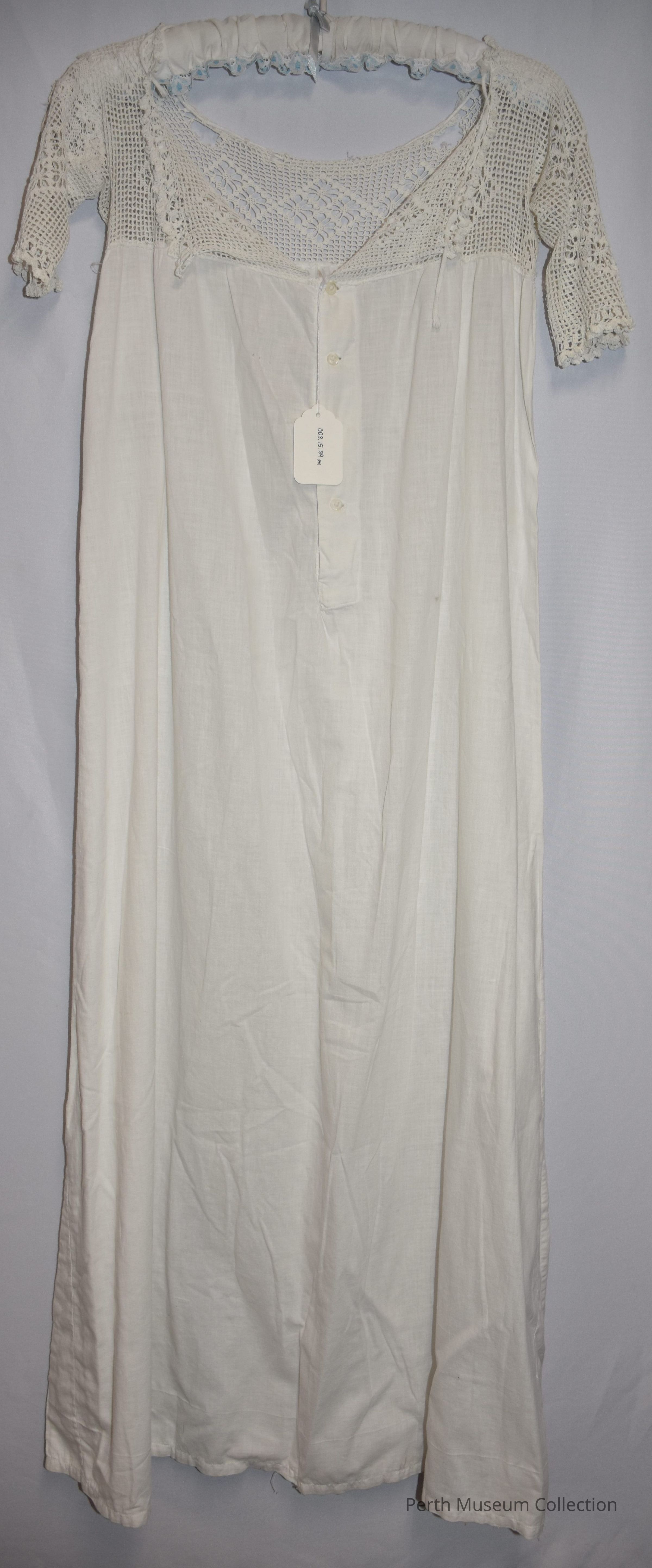 This is a long white cotton and crocheted nightgown. There is a small 1/2" hem at the bottom. There are four white plastic buttons down the front. The top portion which is approximately 4" wide is crocheted and also white. The arms are crocheted as well and are not full-length. A thin piece of white string has been threaded through the neck that could be tied for closure. There are some rips in the crocheted portion, but it is in overall good condition.