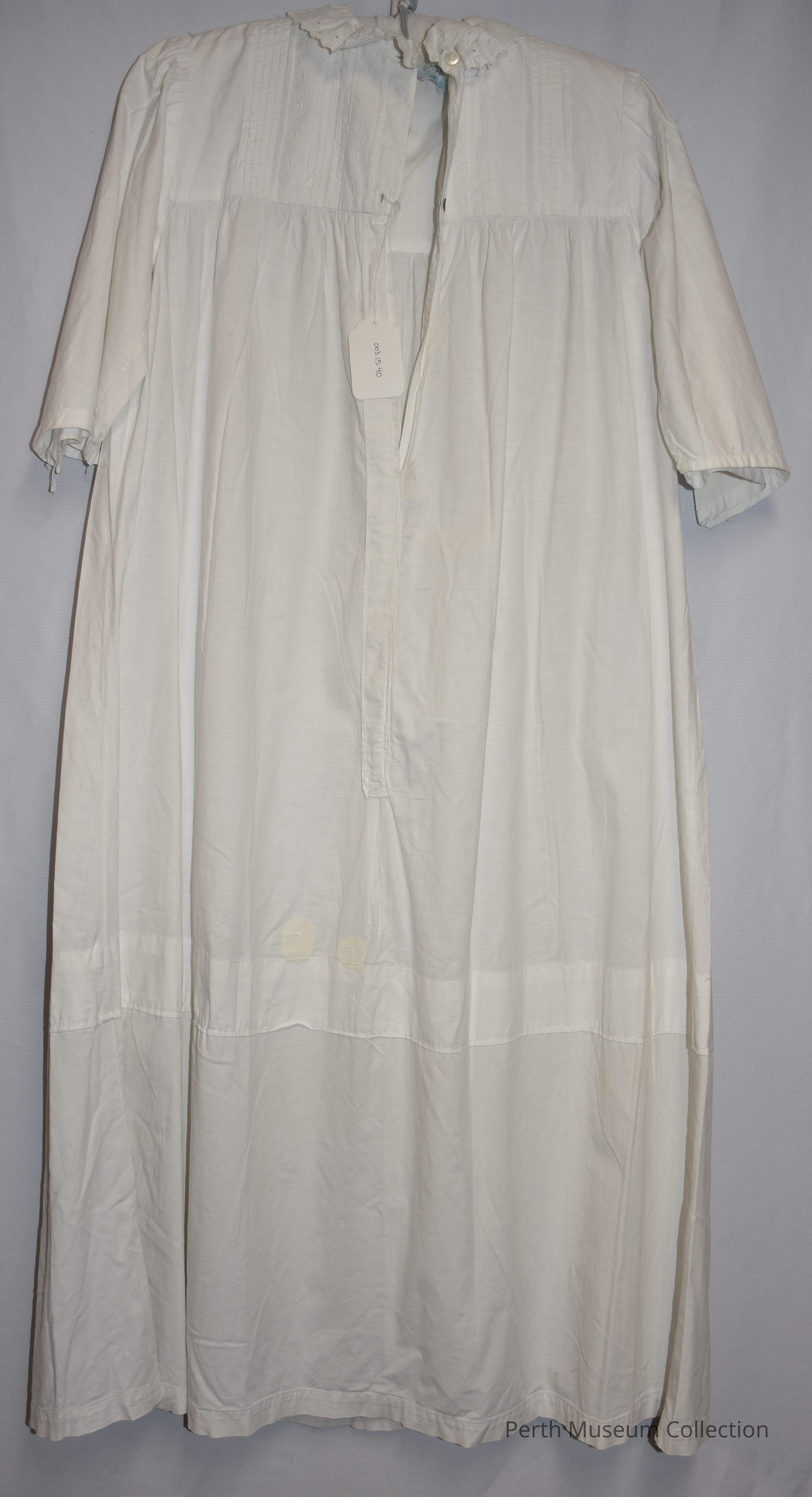 White cotton nightgown. 3/4 length sleeves. Has rounded collar trimmed with crocheted pattern. Front has 2 small buttons in the upper part of night gown where there is also an alternating panel pattern of embroiderey.