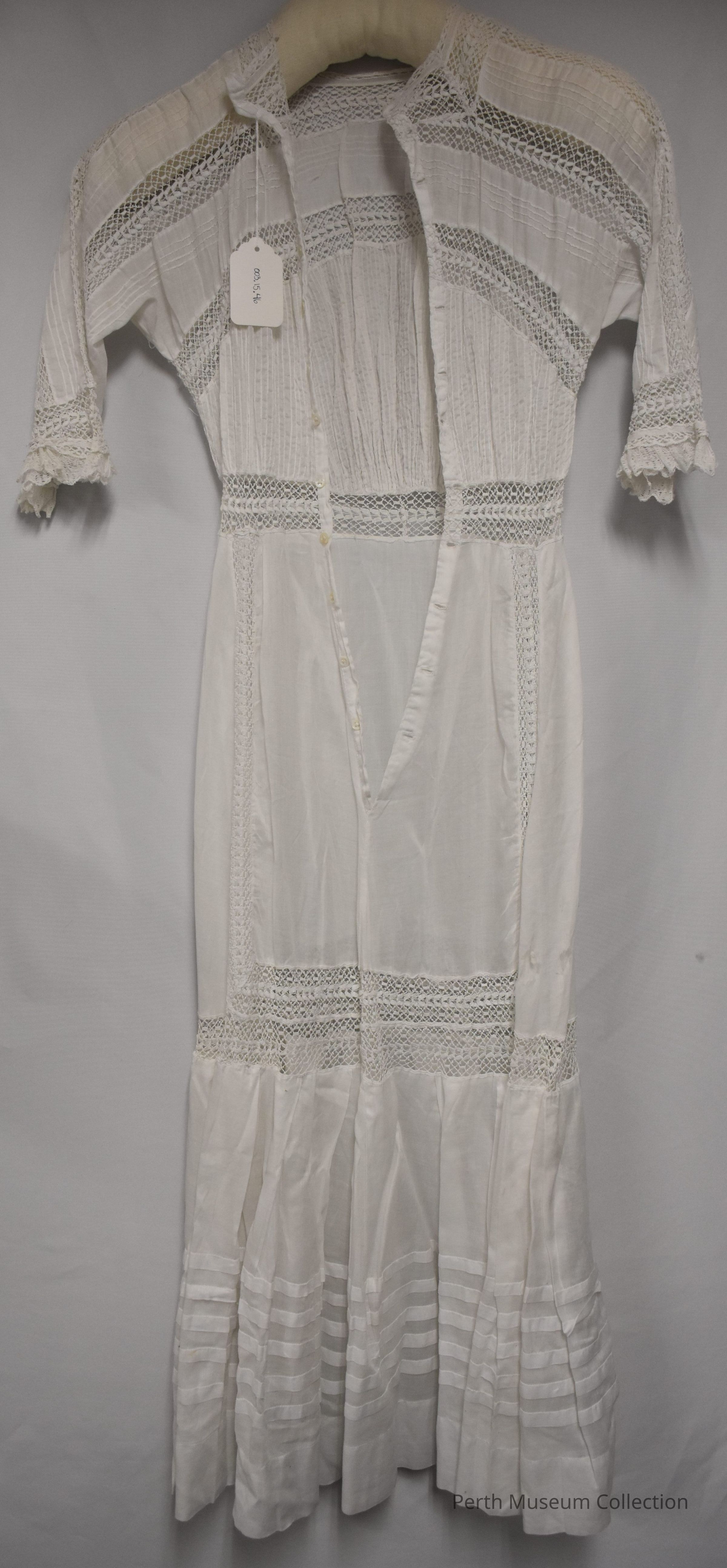 Lawn Dress: White cotton and crocheted. 3/4 length sleeves. Eleven small buttons run down the front. The sleeves are trimmed in a scalloped lace pattern. Throughout the dress are alternating patterns of crochet and cotton.Dimensions