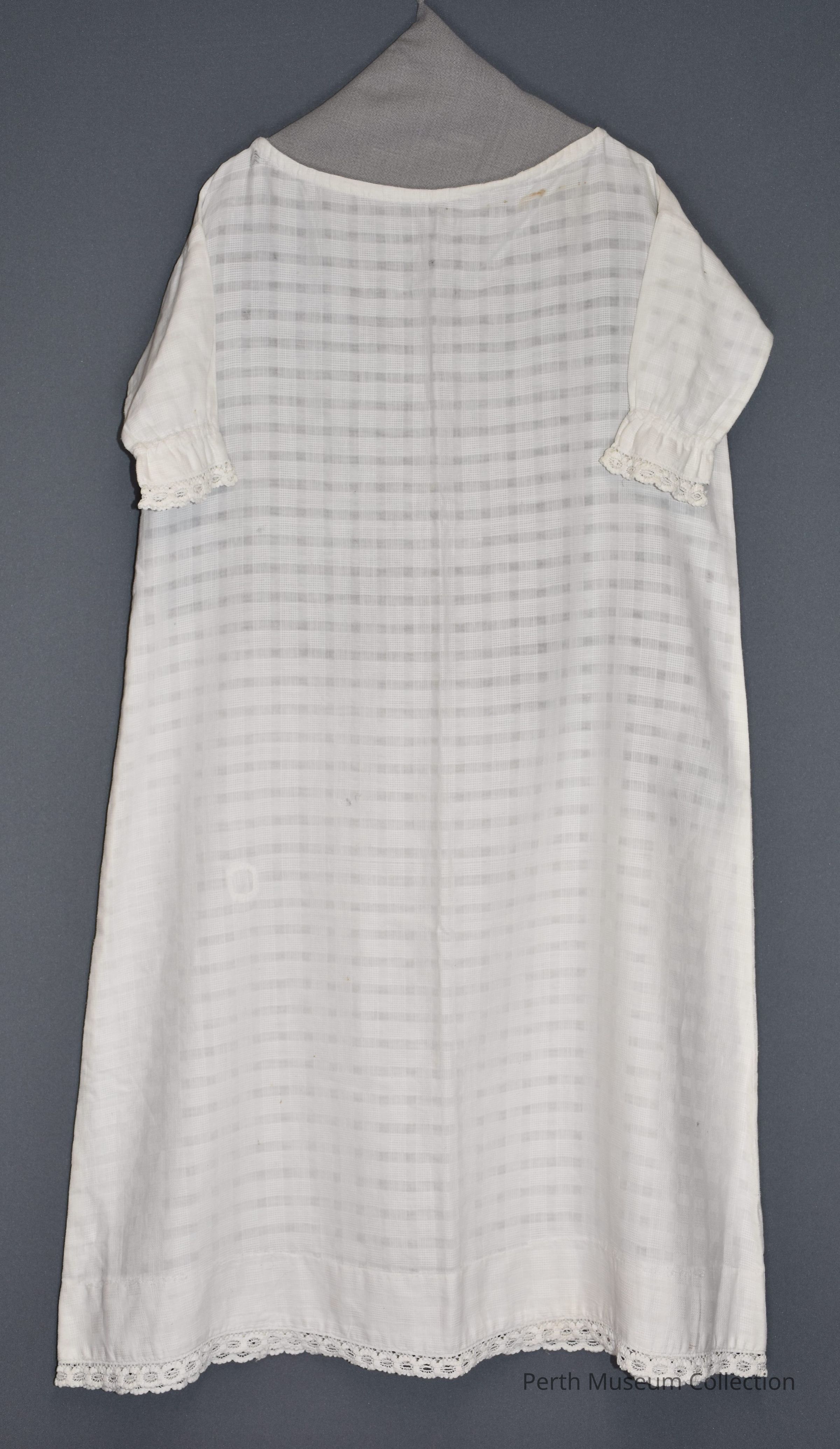 This is a short, white cotton nightgown. There is a thin 1 1/2 cm crocheted trim on the bottom edge, as well as on the cuffs of both arms. There is a small metal snap at the back of the neck to close a 24cm long slit down the back. There is a faint design in raised white thread covering the entire piece. There are some small stains around the neck, but is is in overall good condition.