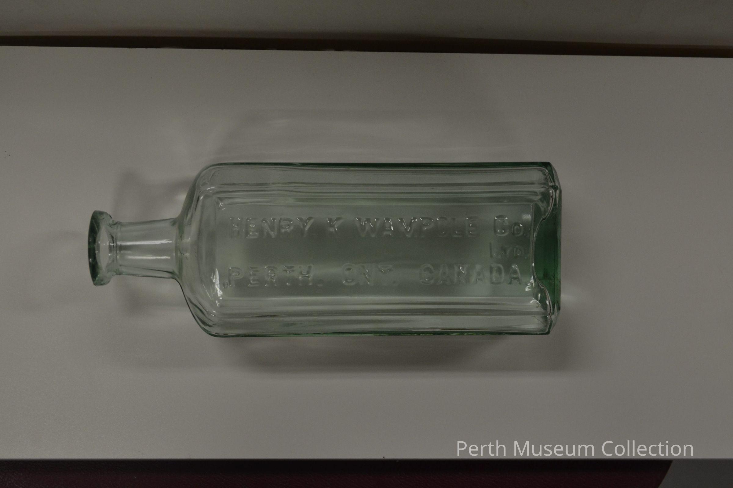 Light green glass, rectangular drug or liniment bottle. It has a one-part finish and a flanged lip. Bore diameter is 2cm. The bottle is rectangular with flat chamfered corners. One side of the bottle is a recessed panel, 14.5 x 4.5cm, in which, in large raised letters is the glass which run sideways, from top to bottom is: