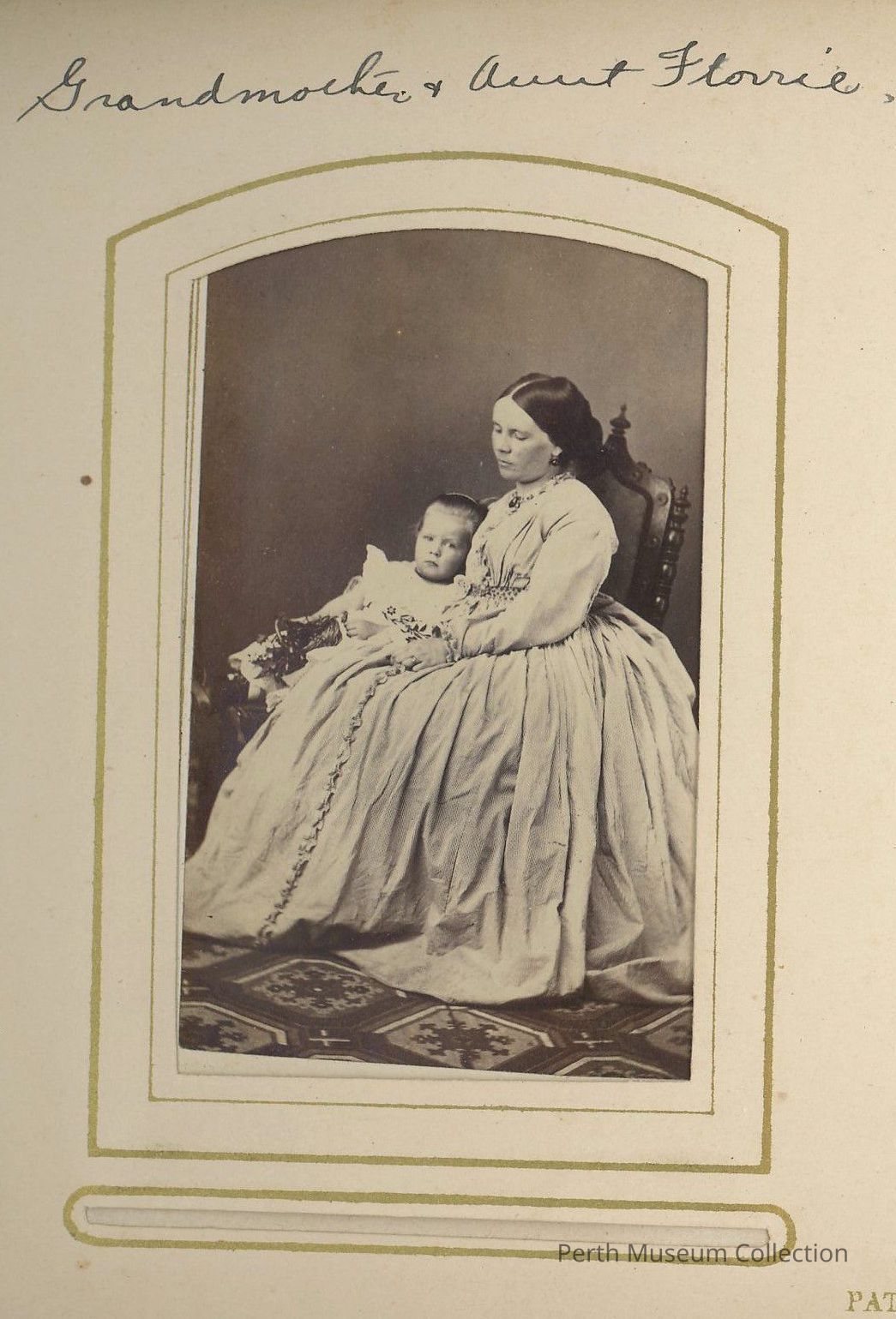 In black ink at top says Grandmother & Aunt Florrie. Flora is sitting in a chair and there is a child sitting beside her. Flora is wearing a light coloured dress and the child is also wearing a light coloured dress.