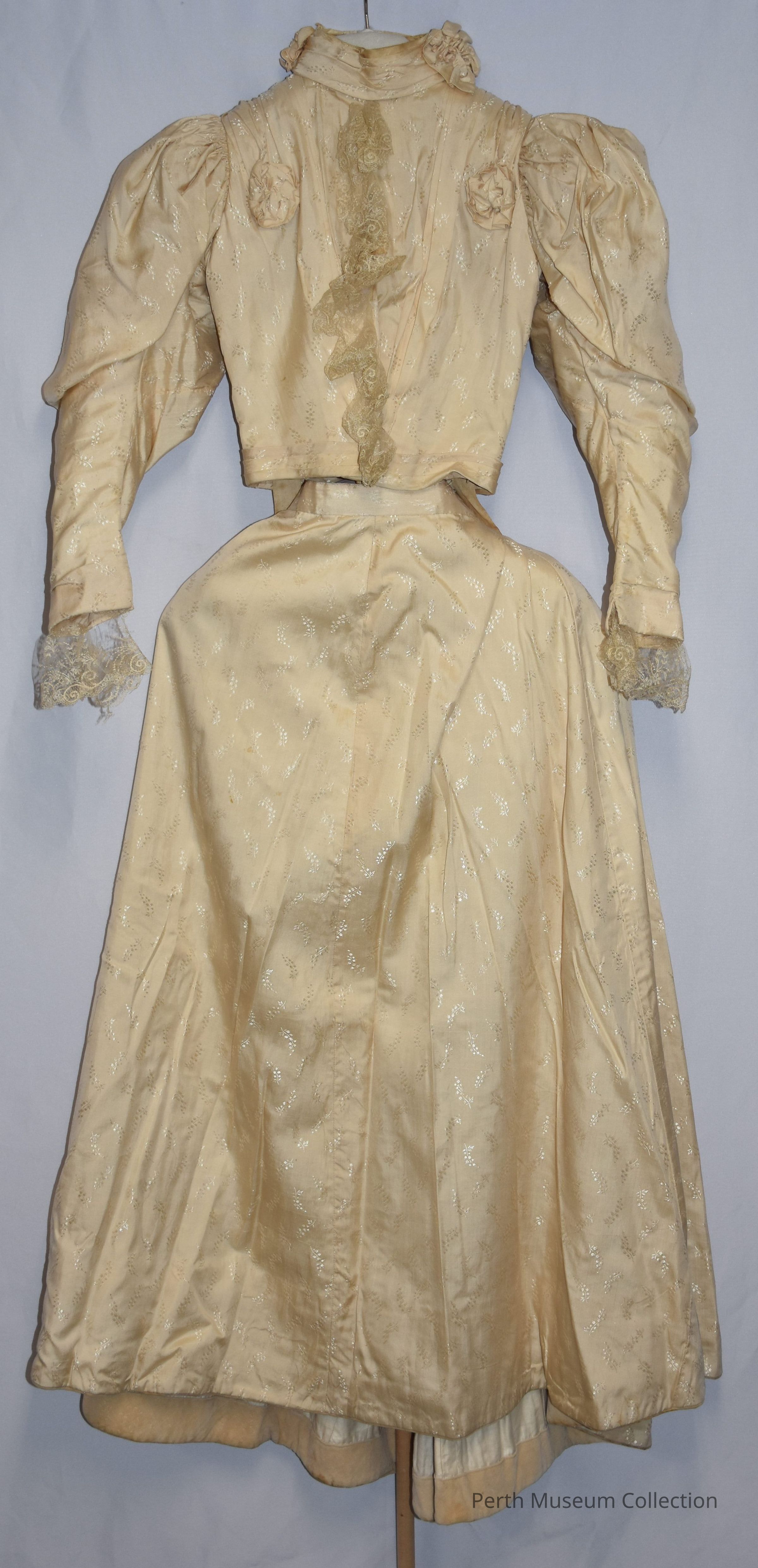 997.61.1a - The bodice of wedding dress of ivory silk brocade has long sleeves with puffed shoulders and lace trim. The high neck has soft fabric rosettes at each side. There is a drape over each shoulder with a rosette at each end in the front and in the back, and a lace jabot from the neckline to the waist.