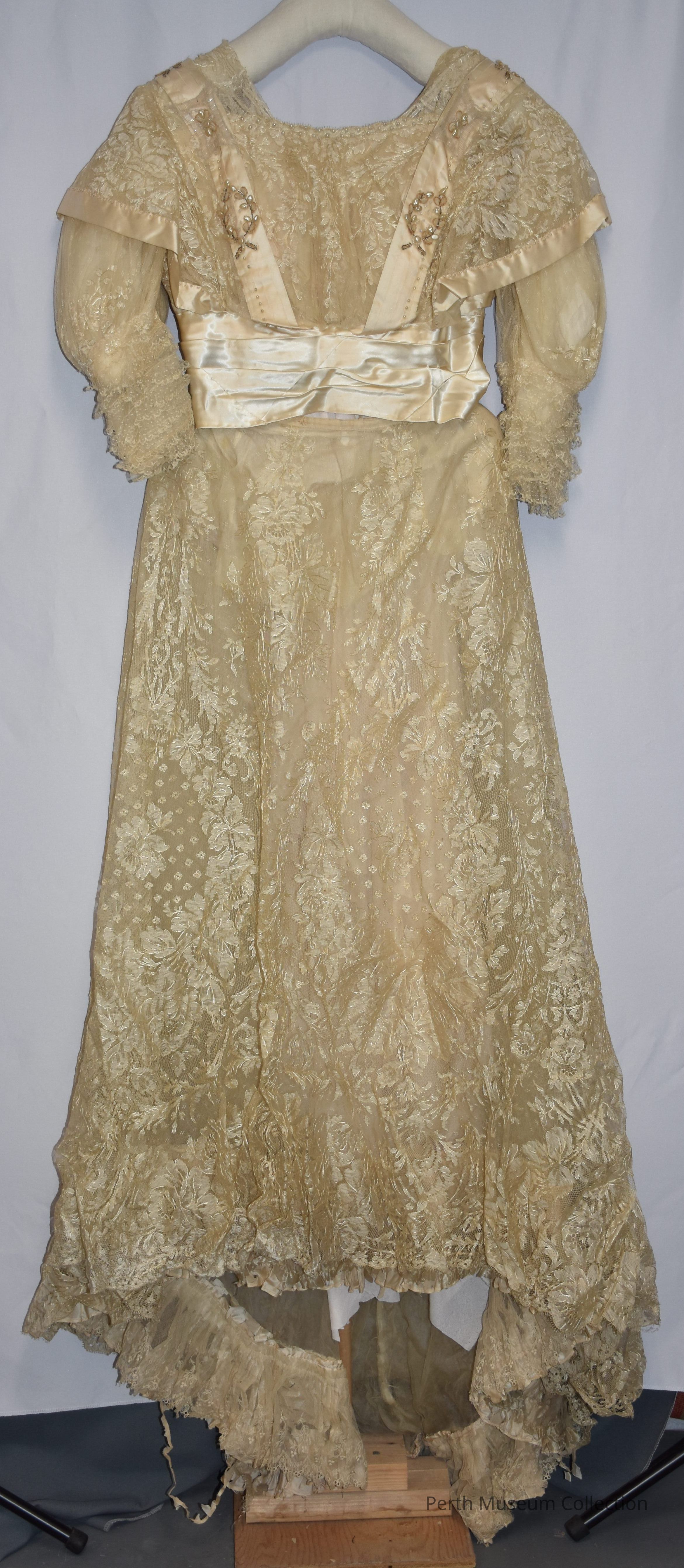 a) Bodice - ivory satin and lace bodice with wide pleated satin sash; satin and lace paniers with pearl like beads, clear bugle beads opaque seed beads; square neck line edge in pearl beads.