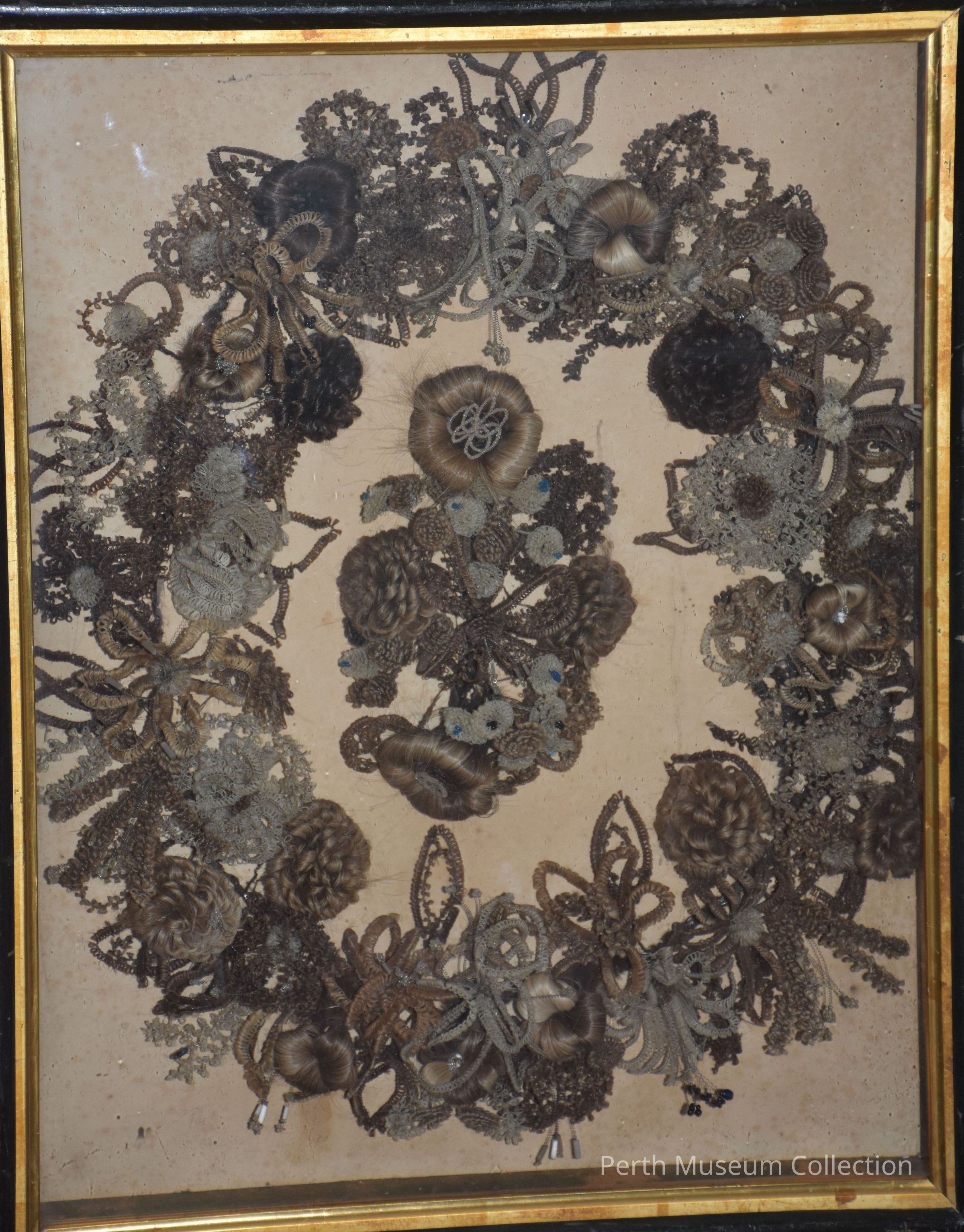2) Victorian Hair Wreath: made of human hair, wool, feathers, glass beads, etc. popular mid 19th century and later.