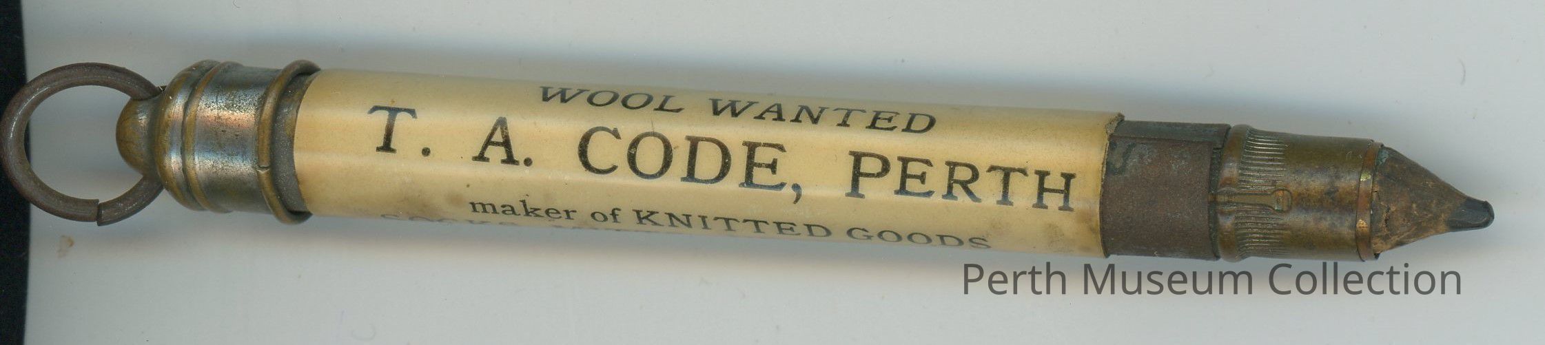 The image shows an old brass bullet pencil with a ring at one end and a sharpened pencil tip at the other, featuring an advertisement on a paper label for "T. A. Code, Perth," a maker of knitted goods, with the phrase "Wool Wanted" indicating their business interest, suggesting the item likely served both as a writing tool and a promotional gift, typically used in a bygone era to advertise and spread awareness for local businesses in a practical manner.