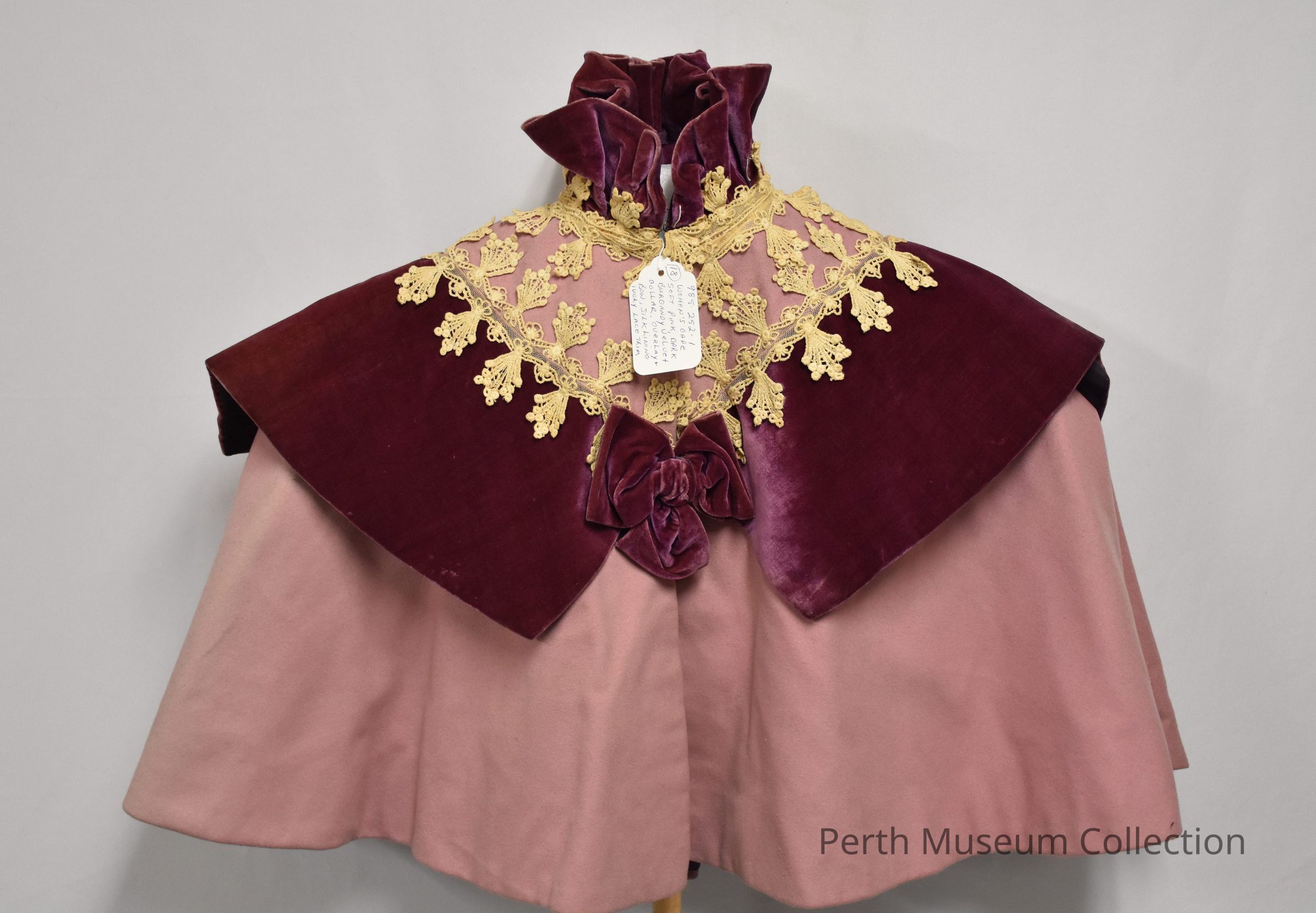 Circular, gathered at neck, standup ruffed collar in purple velvet with top layer purple velvet, longer bottom layer wool, light purple. Satin linging of purple. Decoration of apliqued ivory lace and purple velvet, 3 loop bow. Fastenes shut with hook and eyesDimensions