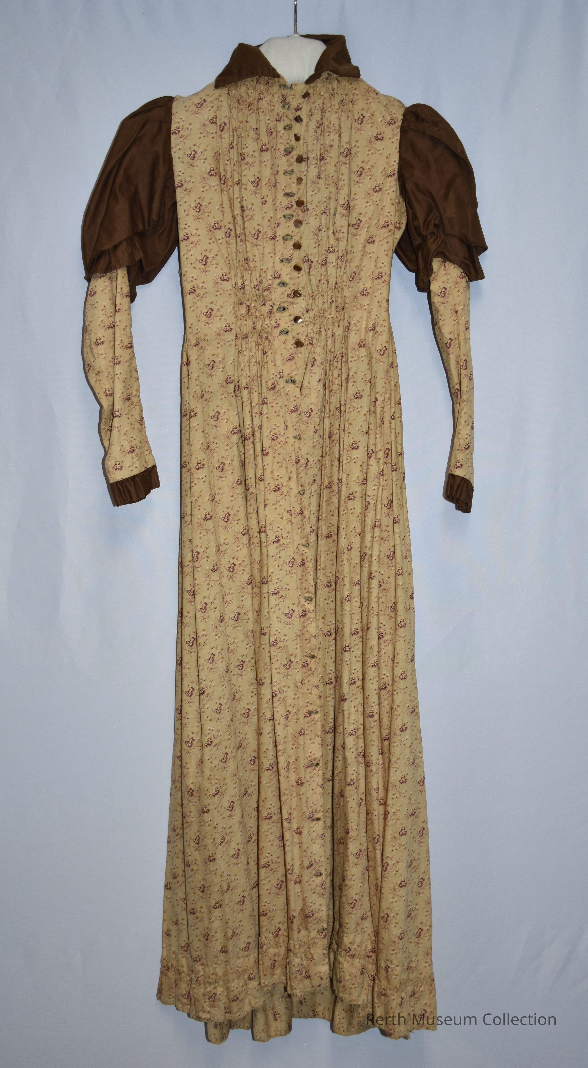 A beige cotton print dress, floor length, buttons down front and has smoked yoke and waist line. Sleeves are long, straight with dark brown puffs sewn on as shoulders and ruffle at cuffs. Dark brown collar, plain.Dimensions