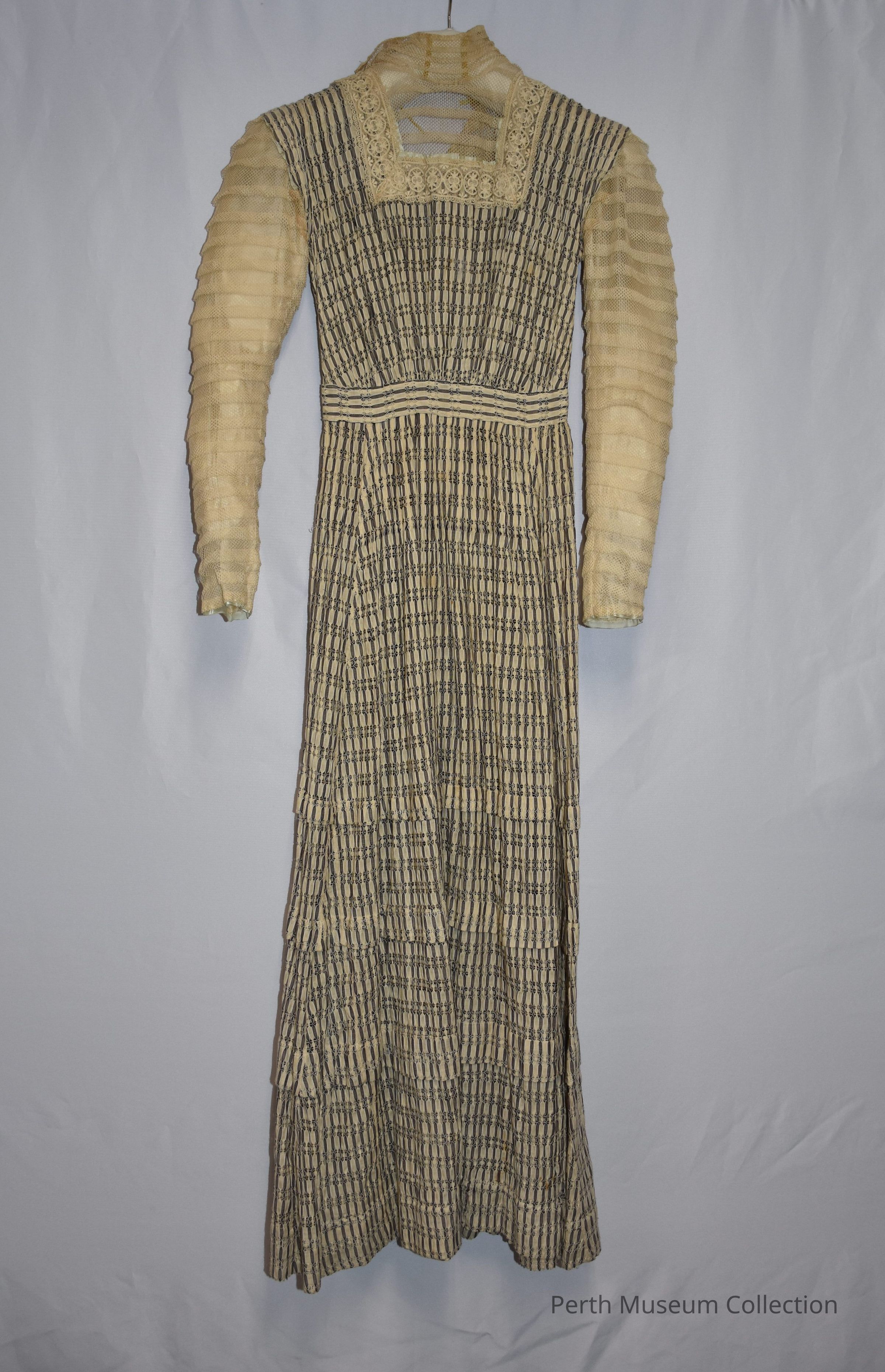 Black and beige floor length with long net sleeves, pleated inset net yoke and standup collar. Skirt is gathered at waist band and a 3 horizontal pleats sewn around.