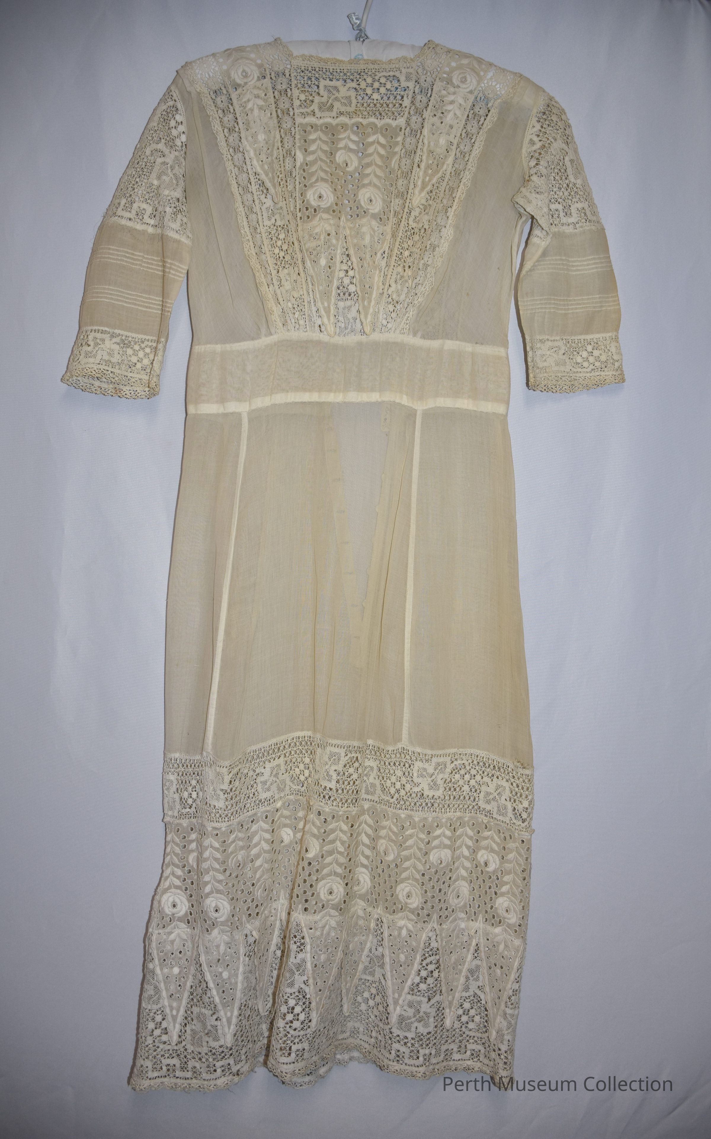 Straight lined, loose waisted, ankle length, 3/4 sleeves, shallow square neckline, dress of gauze like muslin and lace and eyelet insertsDimensions