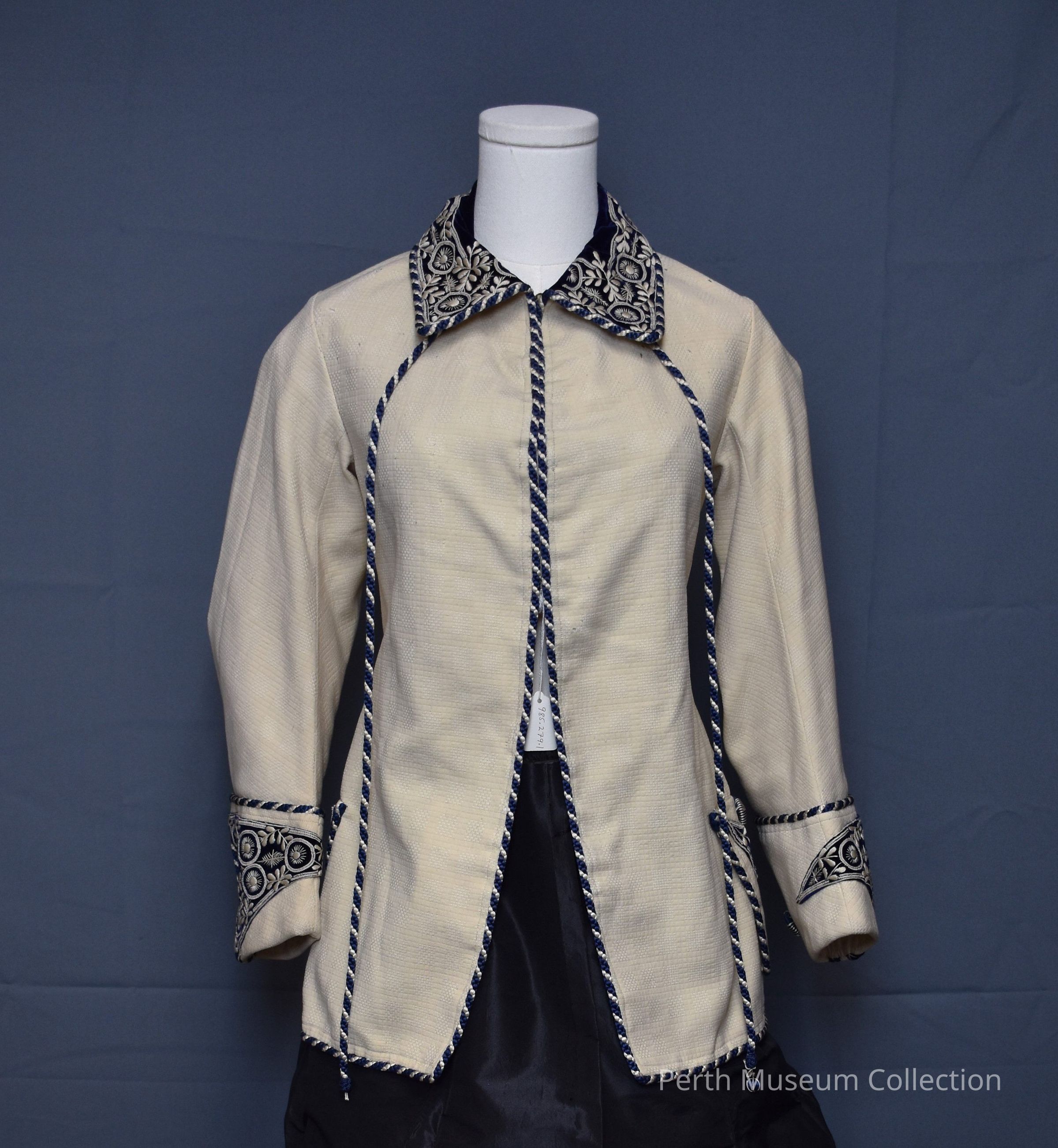 Short, fitted slightly wool jacket of an ivory fancy weave, decorated with navy blue and ivory cord. Black velvet collar. Embroidered in ivory and long cords hanging from collar with 2 tassels.Dimensions