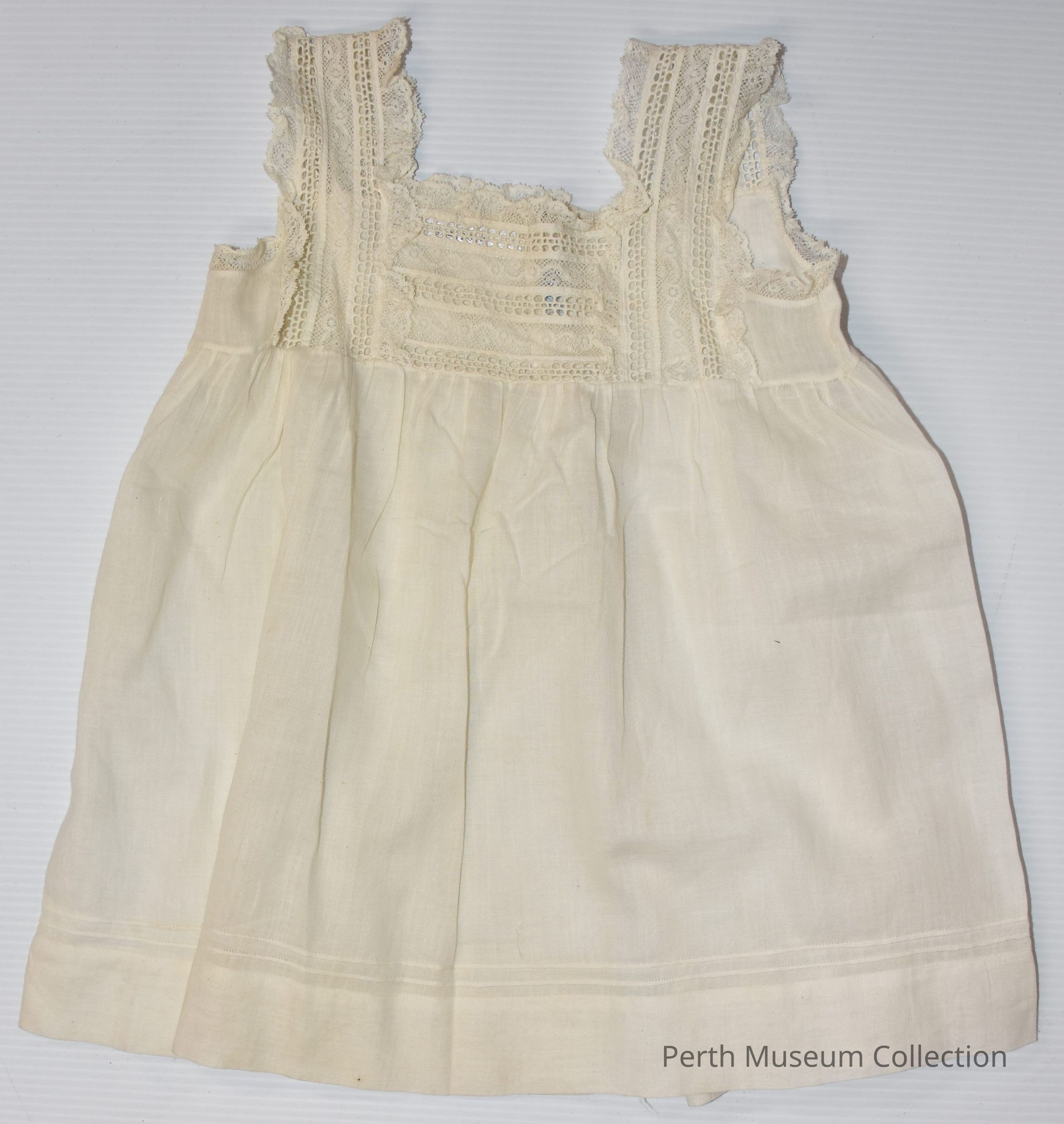 This pinafore is made of fine white lawn, somewhat yellow with age. The front yoke and shoulder straps are made of alternating strips of lace and the lawn fabric with openwork. The shoulder straps are 6 cm wide. The back yoke and underarm section are plain. The skirt is gathered onto the yoke and is plain except for two tiny tucks 5 cm x 4 cm from the bottom edge which go all the way around the skirt. The hem is 4 cm deep. The back is open from yoke to hem and closes with 2 tiny buttons and button holes on the yoke back. It is in excellent condition. A tiny label is stitched onto the back edge of the yoke with the words "De Vlijt Det Menstr 104" embroidered in light blue thread.Dimensions